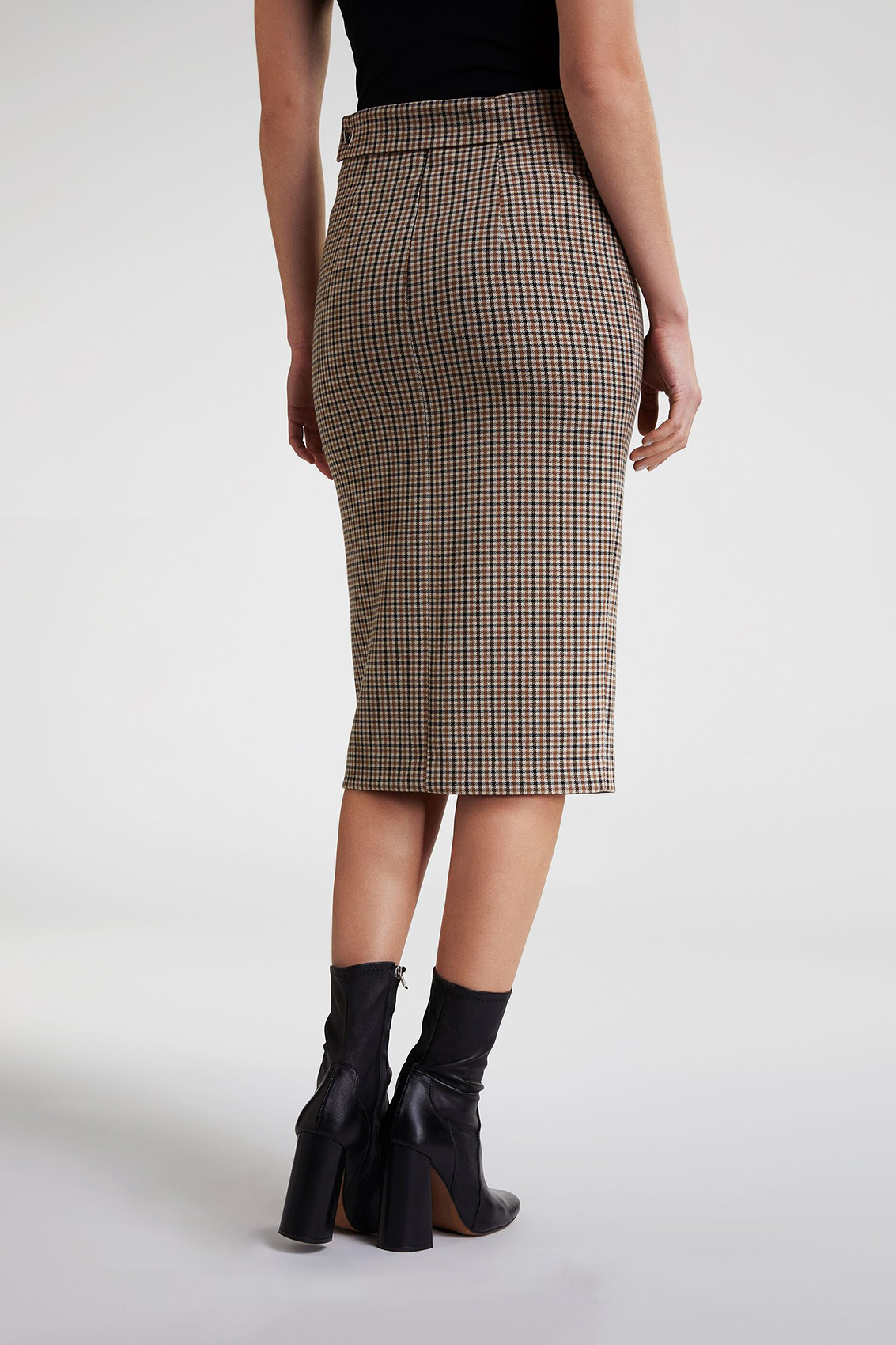 Классическая юбка-карандаш удивляет количеством модных элементов! Средняя посадка, длина чуть ниже колен. Трендовый принт в клетку. Разрез со шлицей спереди. Декоративный пояс на цепочке. Эта юбка станет изюминкой множества стильных образов.