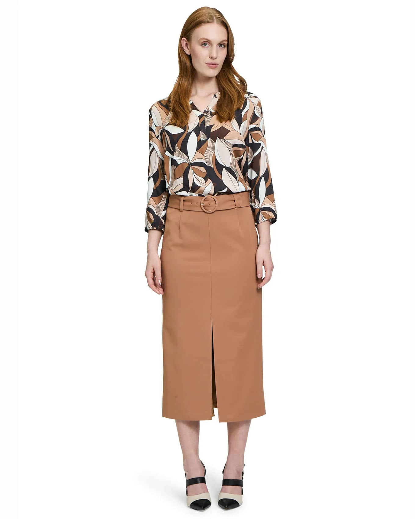 Юбка-карандаш бежевого цвета. Модель высокой посадки со вставным поясом с пряжкой. Длина миди, имеется эффектный разрез по центру шва спереди. Юбка-карандаш - незаменимая классика делового стиля.