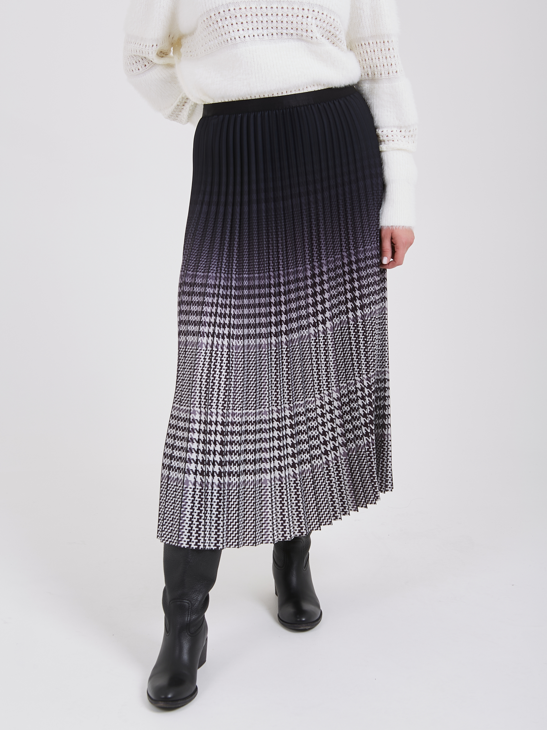 Принт юбки начинается с глубокого чёрного оттенка, плавно переходящего в изысканный узор "гусиная лапка" ближе к низу. Чередующиеся чёрные и белые клетки создают стильный контраст, привлекая внимание. Плиссированная структура добавляет изделию объём и динамику, делая каждый шаг изящным и грациозным.Осень-Зима'25/26. Капсула "Вишневый сад"