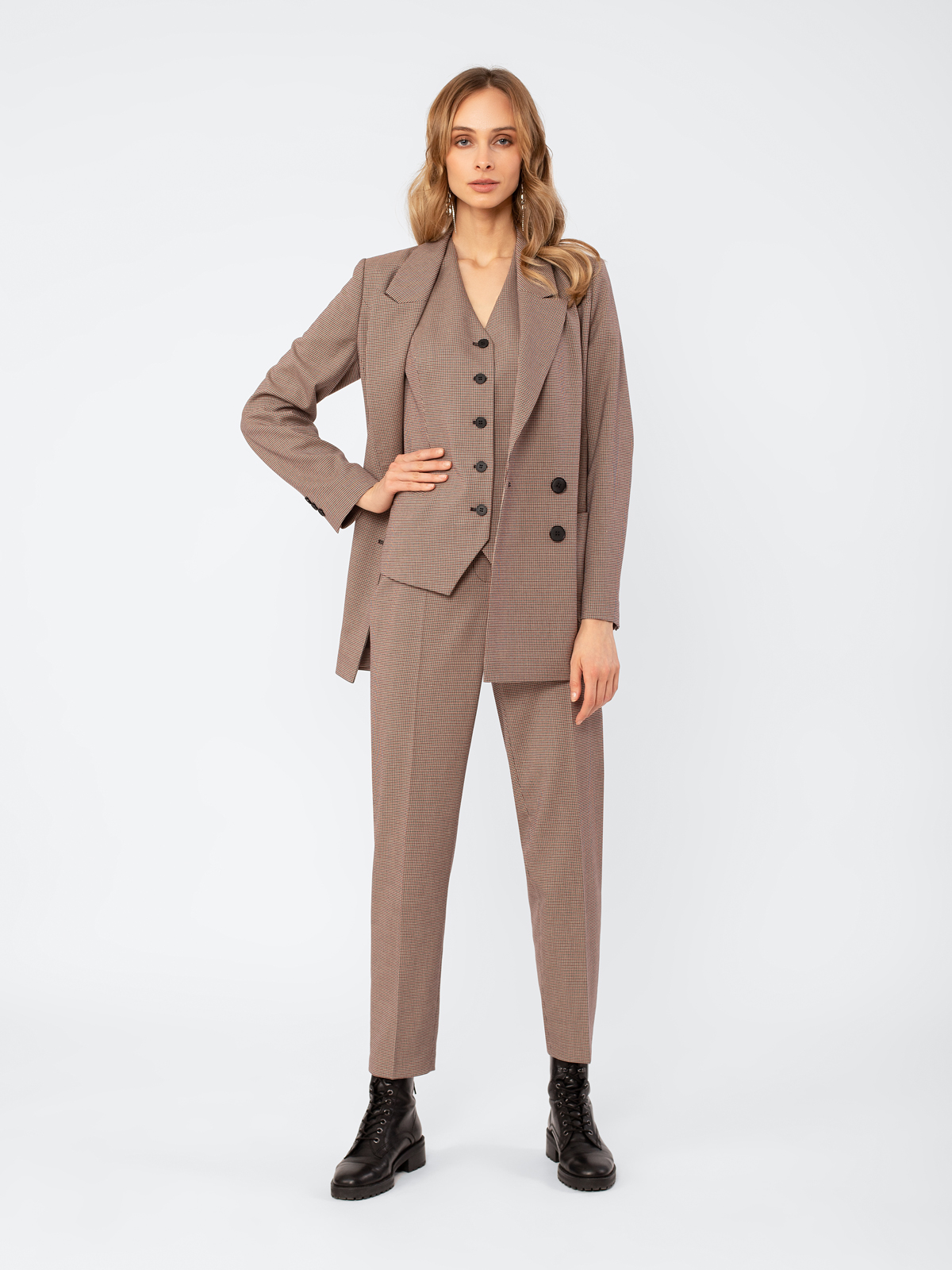 Жакет в стиле кэжуал, прямой свободный силуэт, на подкладке. Воротник английский. Рукав втачной. Застежка двубортная на пуговицы. Карманы накладные.