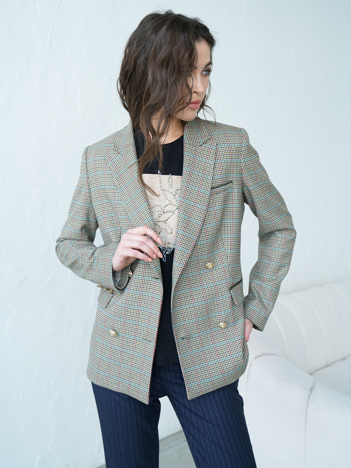 Двубортный жакет в мелкую клетку. Приталенный силуэт, английский воротник с лацканами. Длинный втачной рукав, боковые карманы с клапаном.