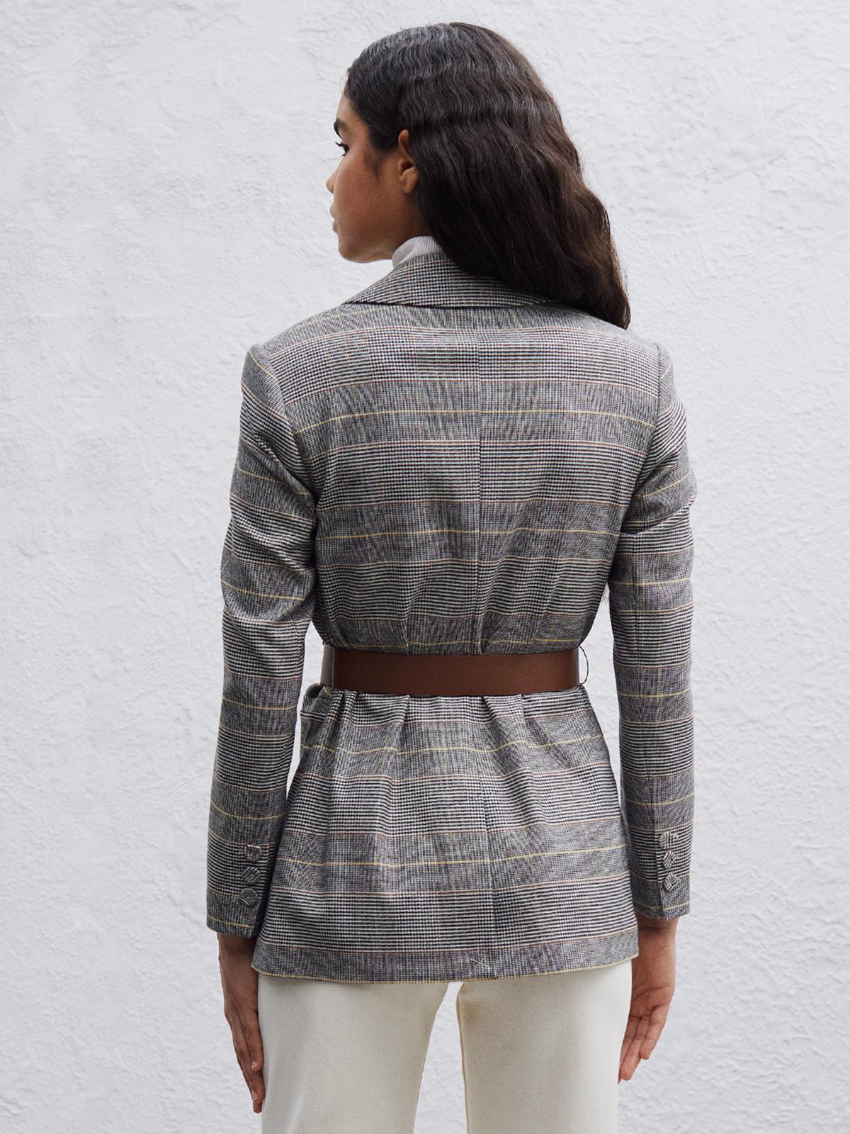 Жакет в мелкую клетку. Приталенный силуэт, английский воротник с лацканами. Длинный втачной рукав, боковые прорезные карманы.