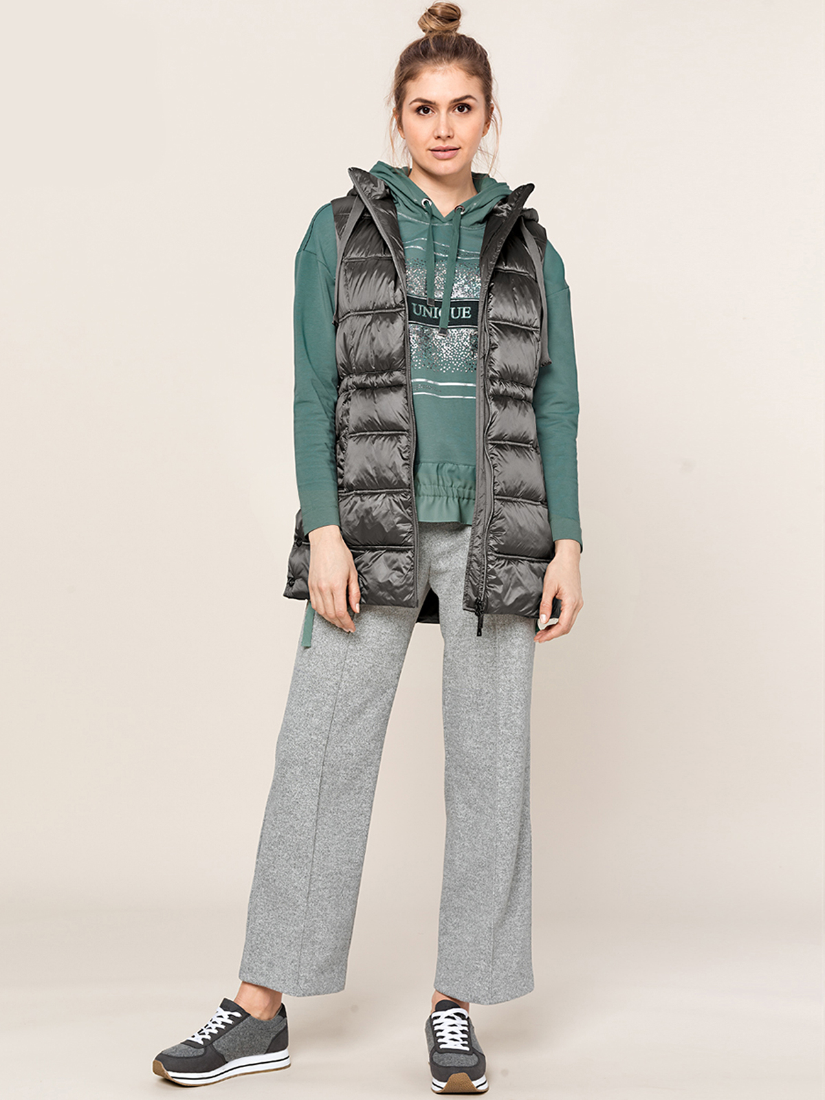 Удлиненный дутый жилет с синтепоновым наполнителем. Объемный капюшон с кулиской. Кулиска на поясе позволяет формировать приталенный силуэт. Застежка на молнию.