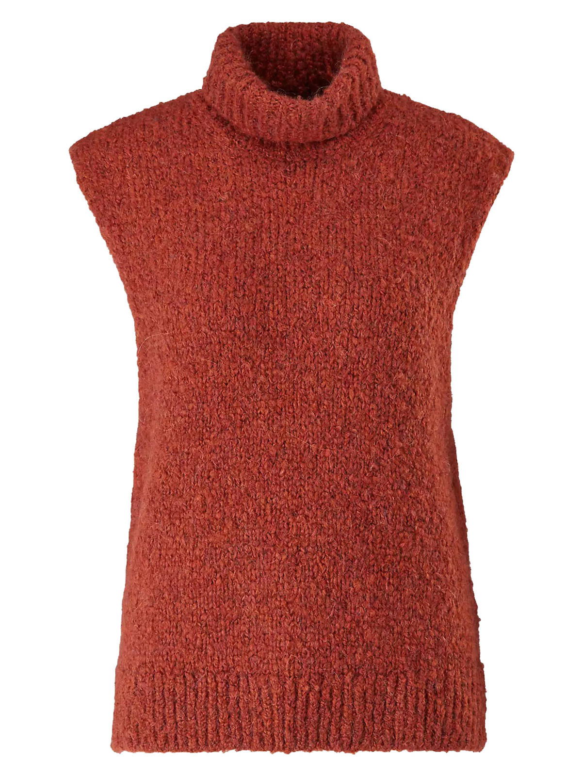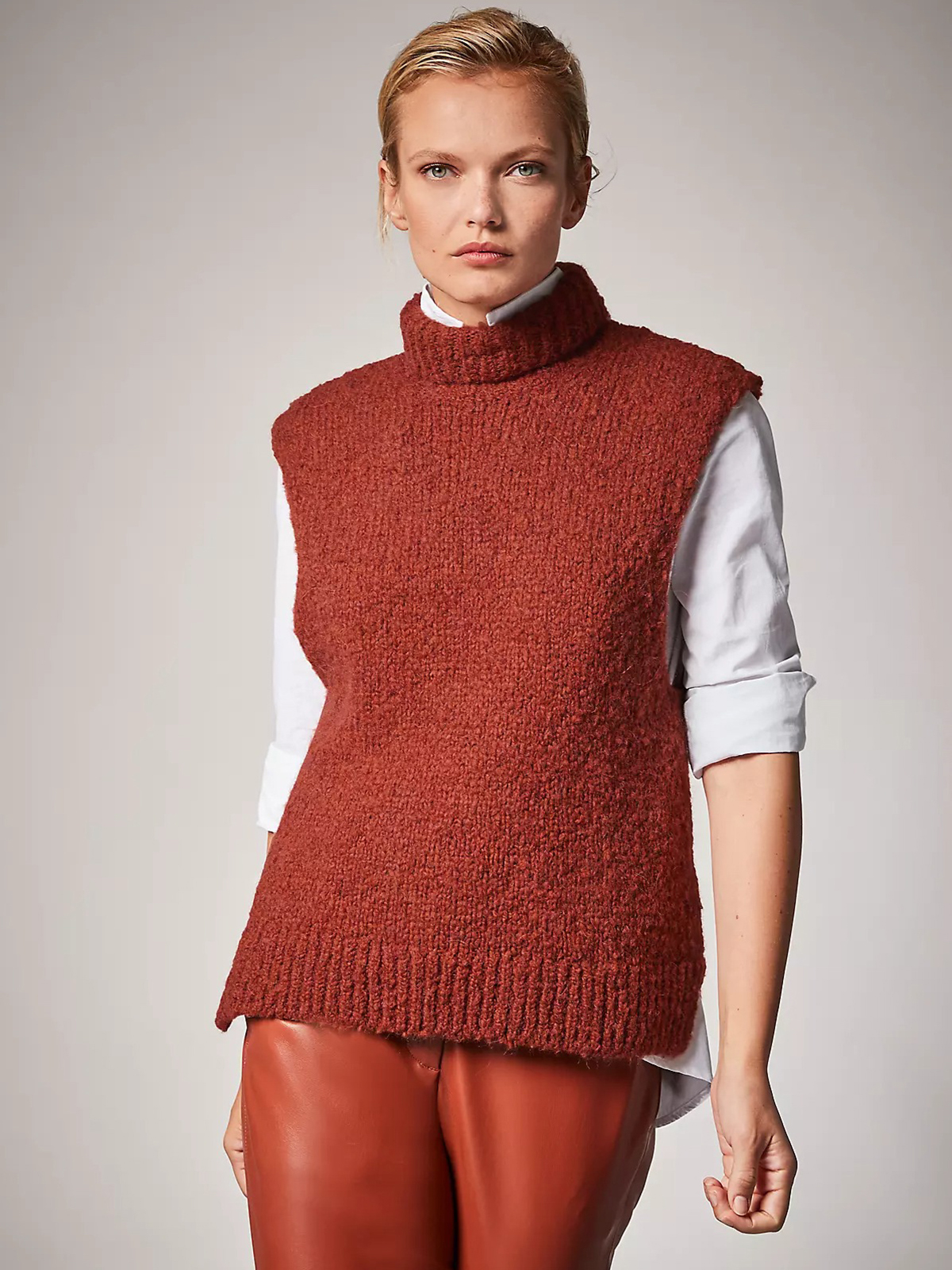 Однотонный вязаный жилет прямого кроя с добавлением шерсти альпаки в составе хорошо сохраняет тепло и приятен на ощупь. Предпочтительнее носить жилет поверх рубашки, джемпера или водолазки. Высокий воротник-стойка, по низу вязаная резинка в рубчик.