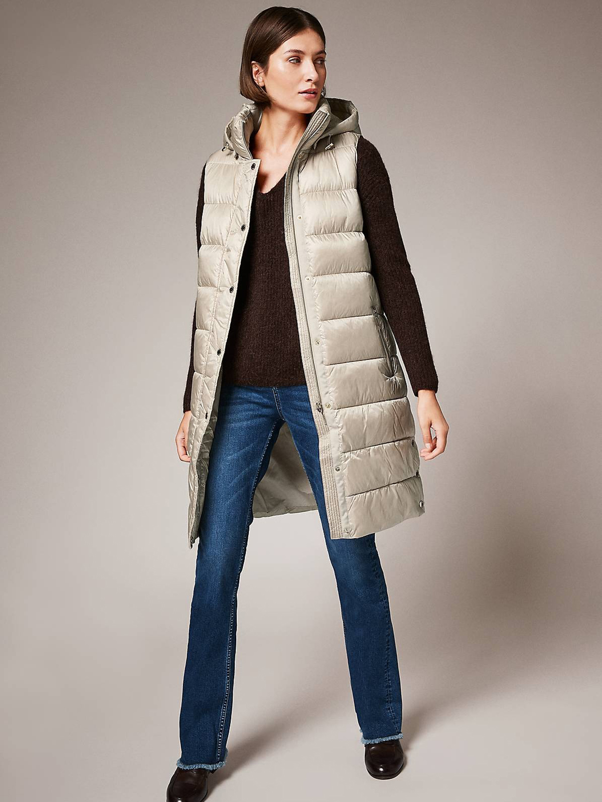 Удлиненный стеганый жилет базового оттенка – теплый и стильный элемент аутфита. Подойдет для образов в спортивном или повседневном стиле, а также для образов спорт-шик. Застежка на молнию и клепки. Объемный капюшон защищает от ветра.