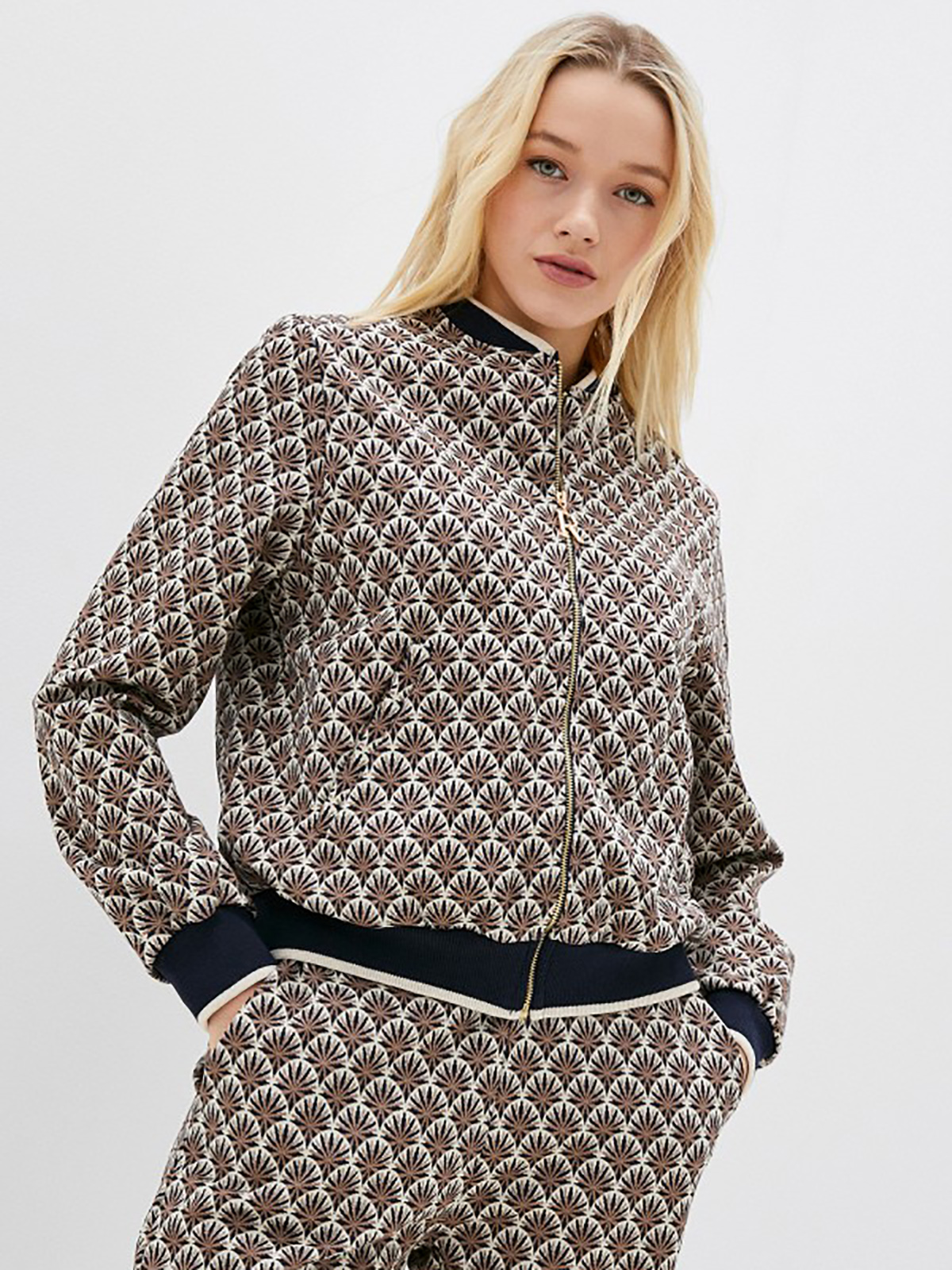 Блейзер с абстрактным принтом по всей поверхности. Застежка на молнию, воротник стойка.