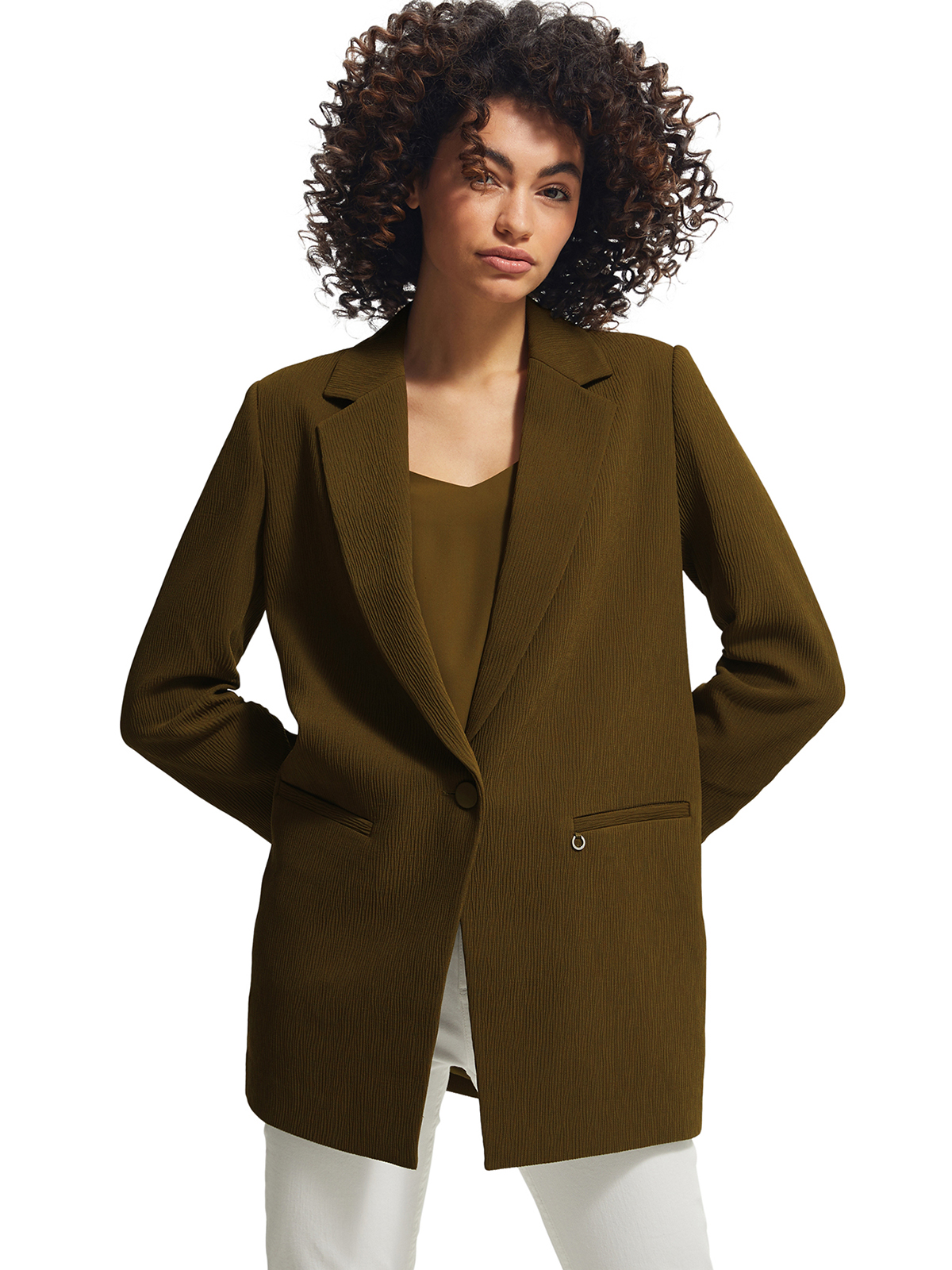 Блейзер прямого кроя на одной пуговице. Отложной английский воротник с лацканами.Врезные карманы с листочкой.