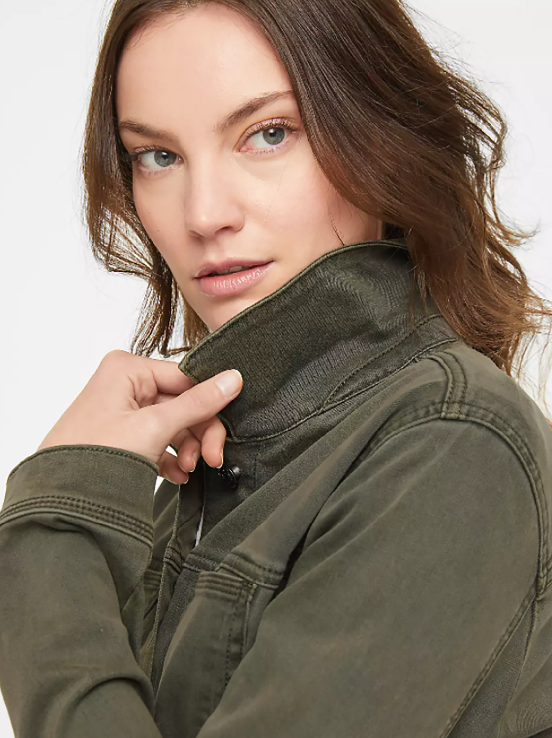Однотонная джинсовка цвета хаки – универсальная вещь для повседневного городского образа. Отложной рубашечный воротник, накладные карманы с клапаном на груди. Втачной рукав полной длины.