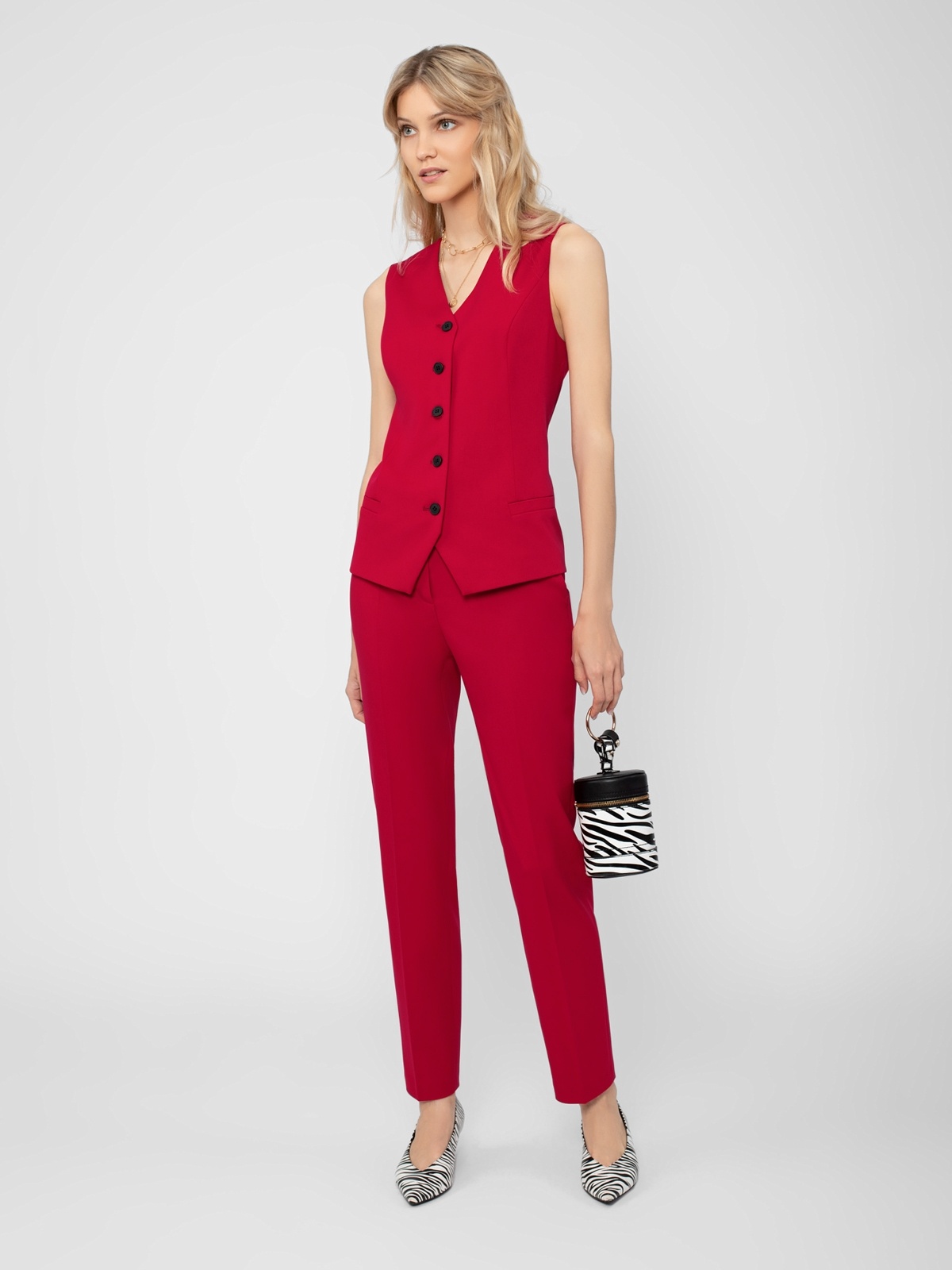 Жилет на подкладке полуприлегающего силуэта с v-образным вырезом горловины и прорезными карманами-листочками. Застежка спереди на пуговицы.