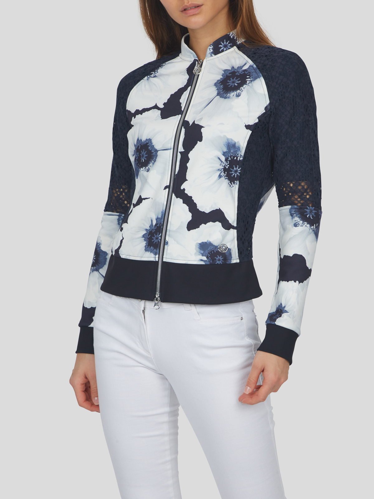 Приталенный блейзер на молнии выполнен в цветочном узоре. Рукав реглан состоит из сетки крупной вязки до сгиба локтя. По низу рукава эластичный манжет, также эластичная лента идет по низу изделия.