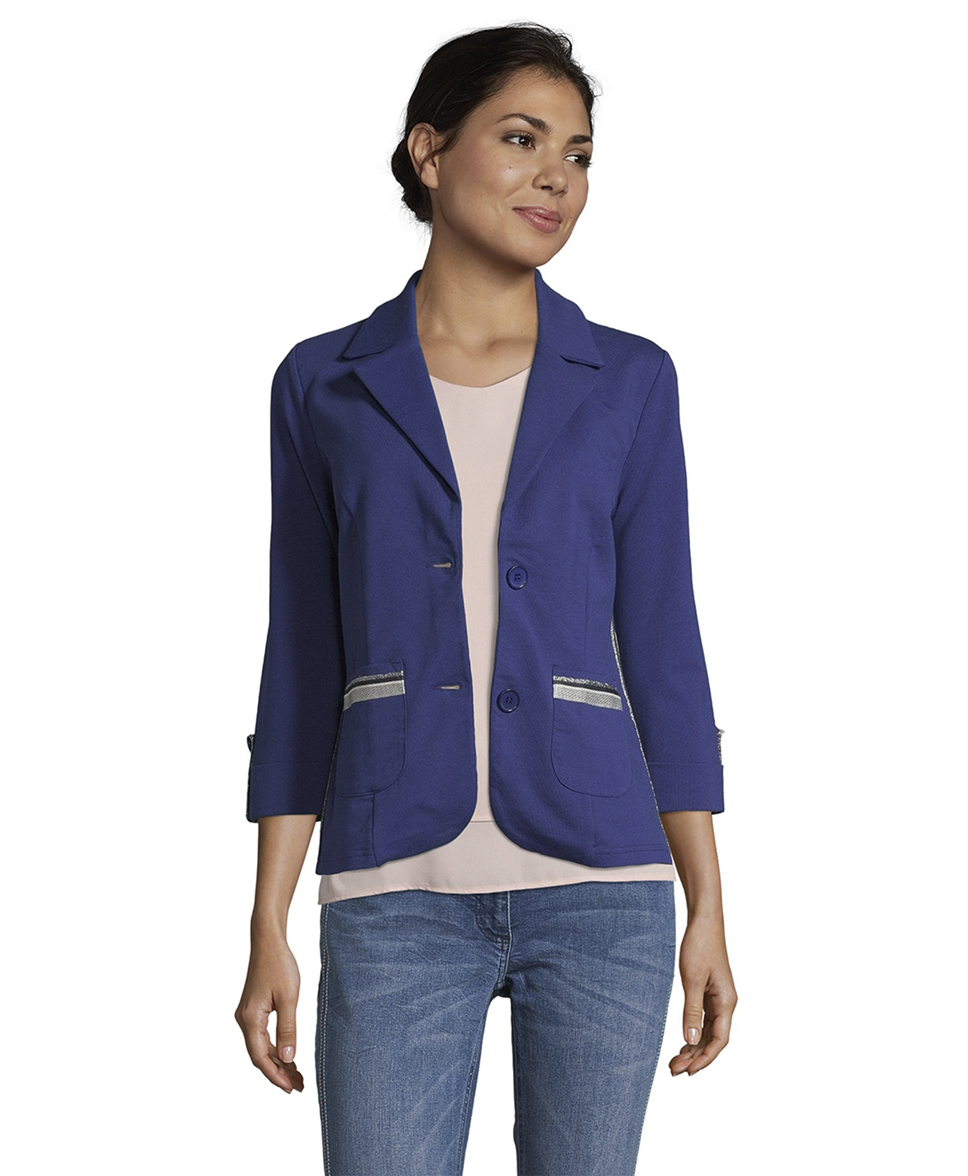 Классический жакет - абсолютно необходимый элемент женского гардероба! Слегка приталенный крой подчеркивает достоинства фигуры. Отложной воротник, застежка на пуговицах, рукава 3/4 с патой для подворачивания, карманы с отделкой. Блестящая тесьма придает образу нотку гламура. Материал из хлопковой смеси приятен к телу и обеспечивает комфорт. Этот жакет будет изюминкой как делового, так и кэжуал образа.