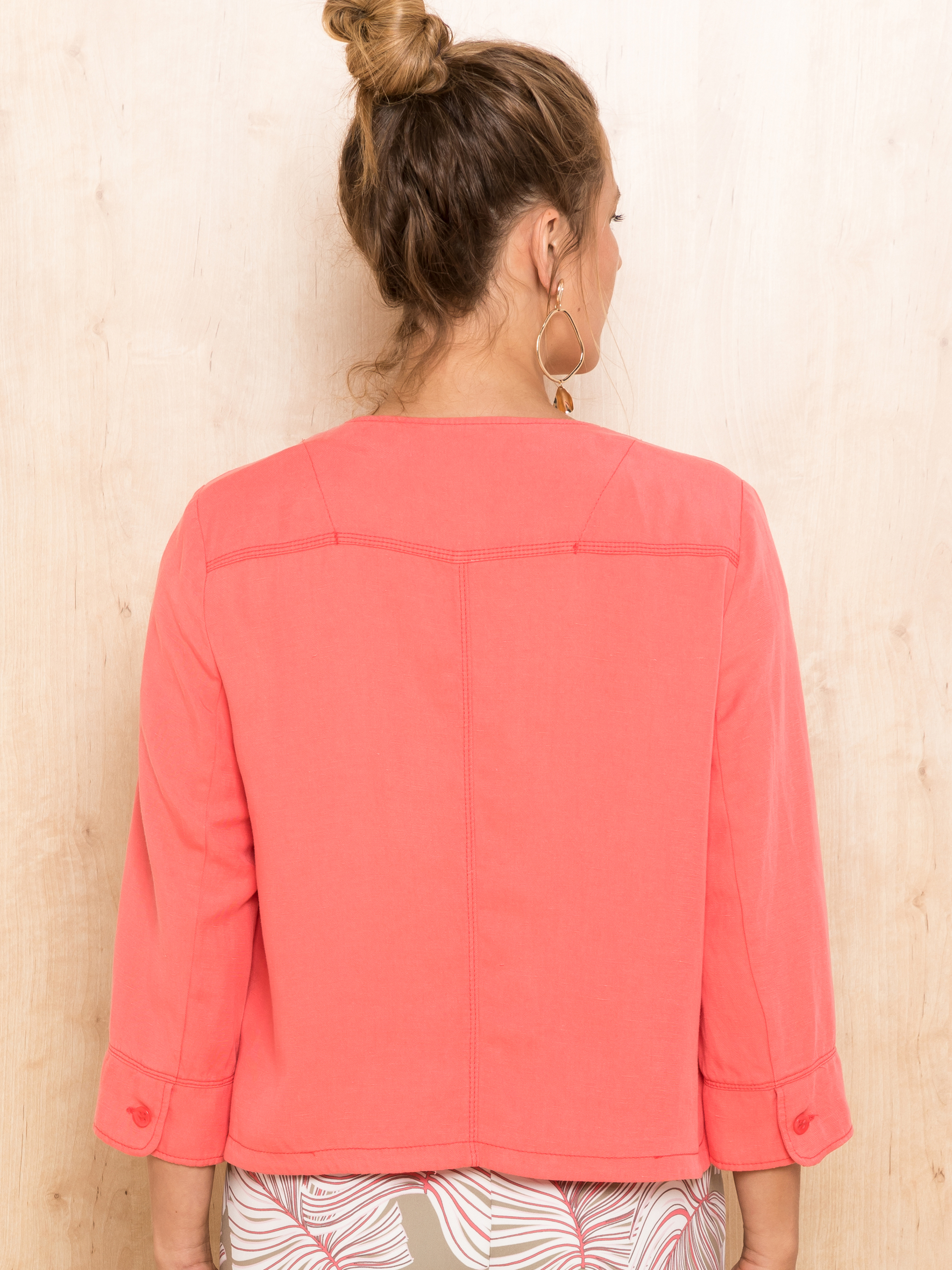 Однотонный жакет в яркой расцветке создаст летнее настроение! Ткань из смеси люцелла и льна идеально подойдет для жаркой летней погоды. Овальный вырез горловины без воротника, планка с пуговицами в тон изделия. Втачной рукав длиной 3\4.