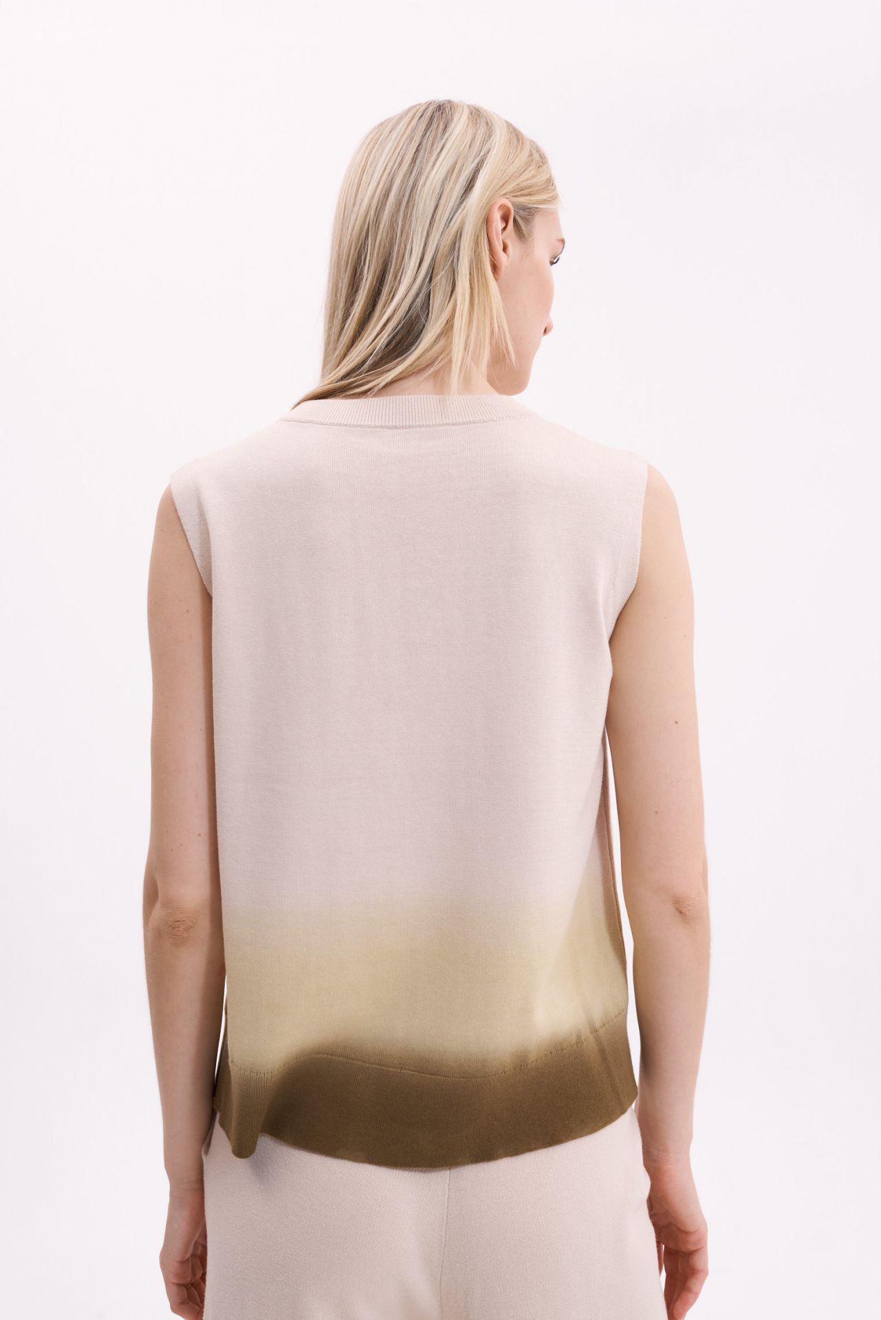 Свободный трикотажный топ без рукавов. Узкая круглая шея с рубчатыми манжетами.