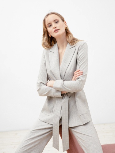 Российский бренд. На сайте указаны Российские размеры. Жакет из мягкой костюмной ткани с вискозой в составе полуприлегающего силуэта с английским воротником, втачным рукавом и крупными накладными карманами. Застежка спереди на пуговицу. В комплекте съемный пояс из ткани для создания более приталенного силуэта. Модель идеально сочетается с брюками POMPA (арт. 3118483rm0190)