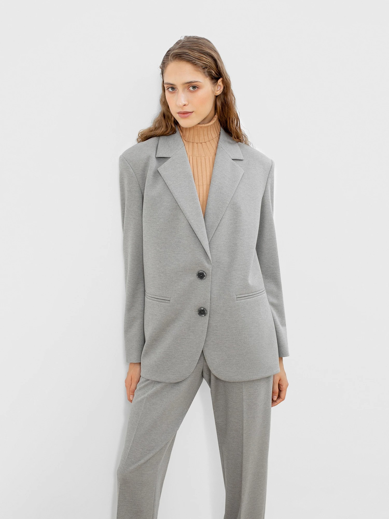 На сайте указаны Российские размеры Стильный жакет на подкладке удлиненного прямого силуэта из трикотажного полотна с v-образным вырезом, английским воротником и укороченным втачным рукавом. Низ бортов закруглённый. Спереди рабочие карманы в рамку и застежка на две пуговицы. Рост модели на фото - 175 см.