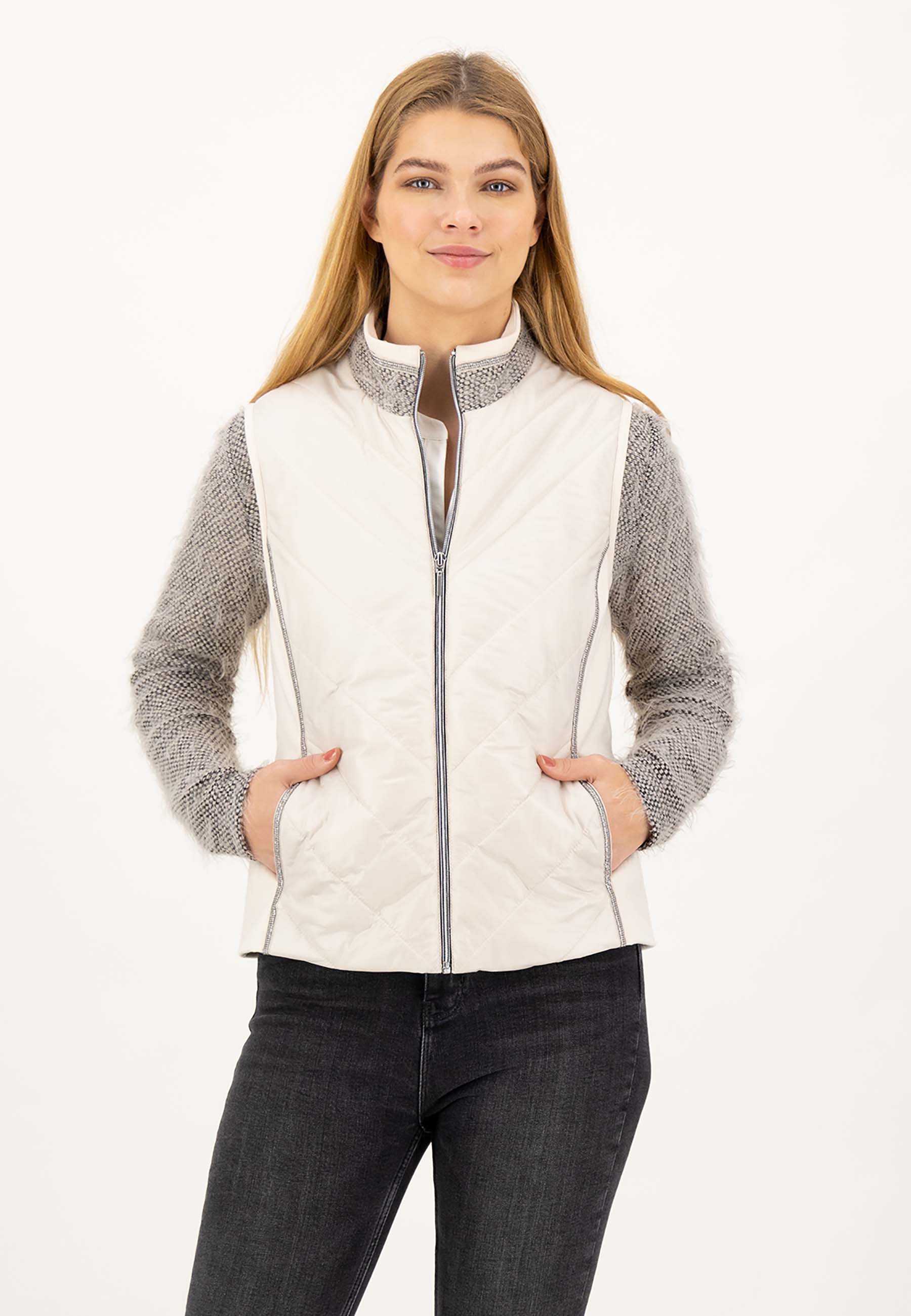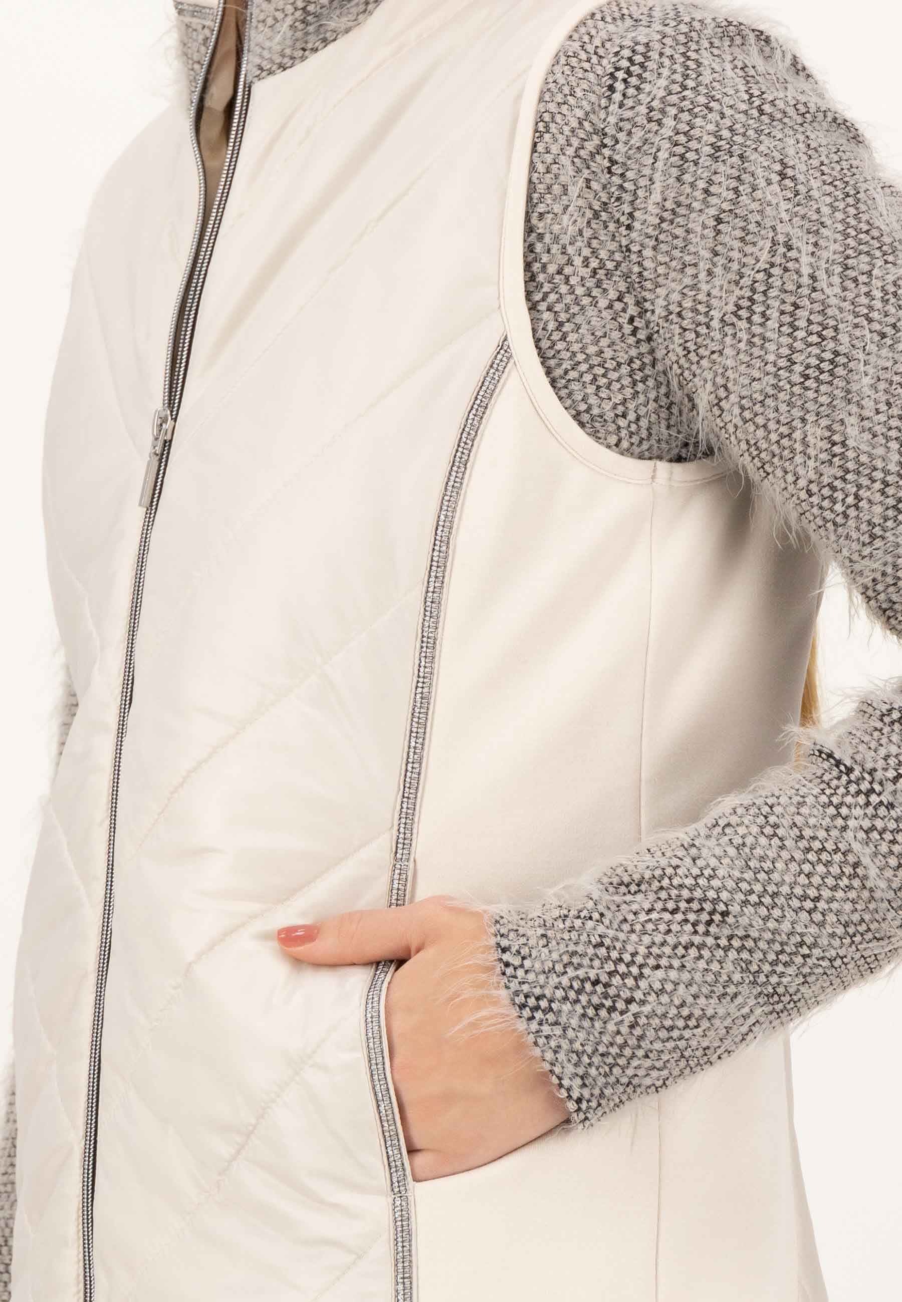 На сайте указаны российские размеры. Стеганая безрукавка из эксклюзивного сочетания материалов с элегантной трикотажной вставкой. Изюминкой стеганого жилета являются модный вязаный воротник и блестящие контрастные швы. Двусторонняя молния и высокий застегивающийся воротник особенно практичны и подчеркивают приятный комфорт при ношении. Наша модель ростом 177 см. Измерения для 44 размера: Окружность груди: 102 см Талия: 95,1 см Бедра: 42 дюйма Длина спинки: 60 см.