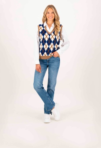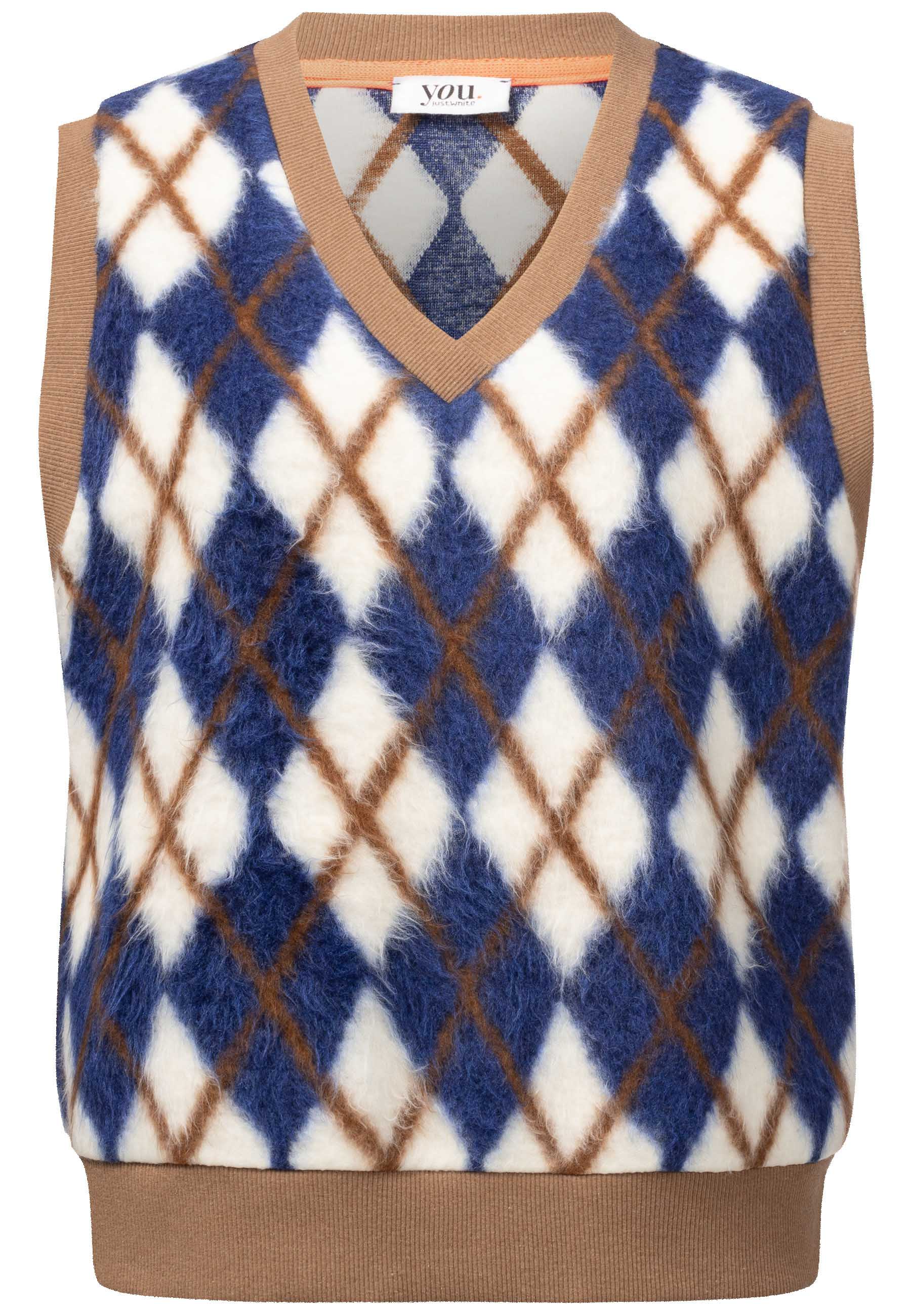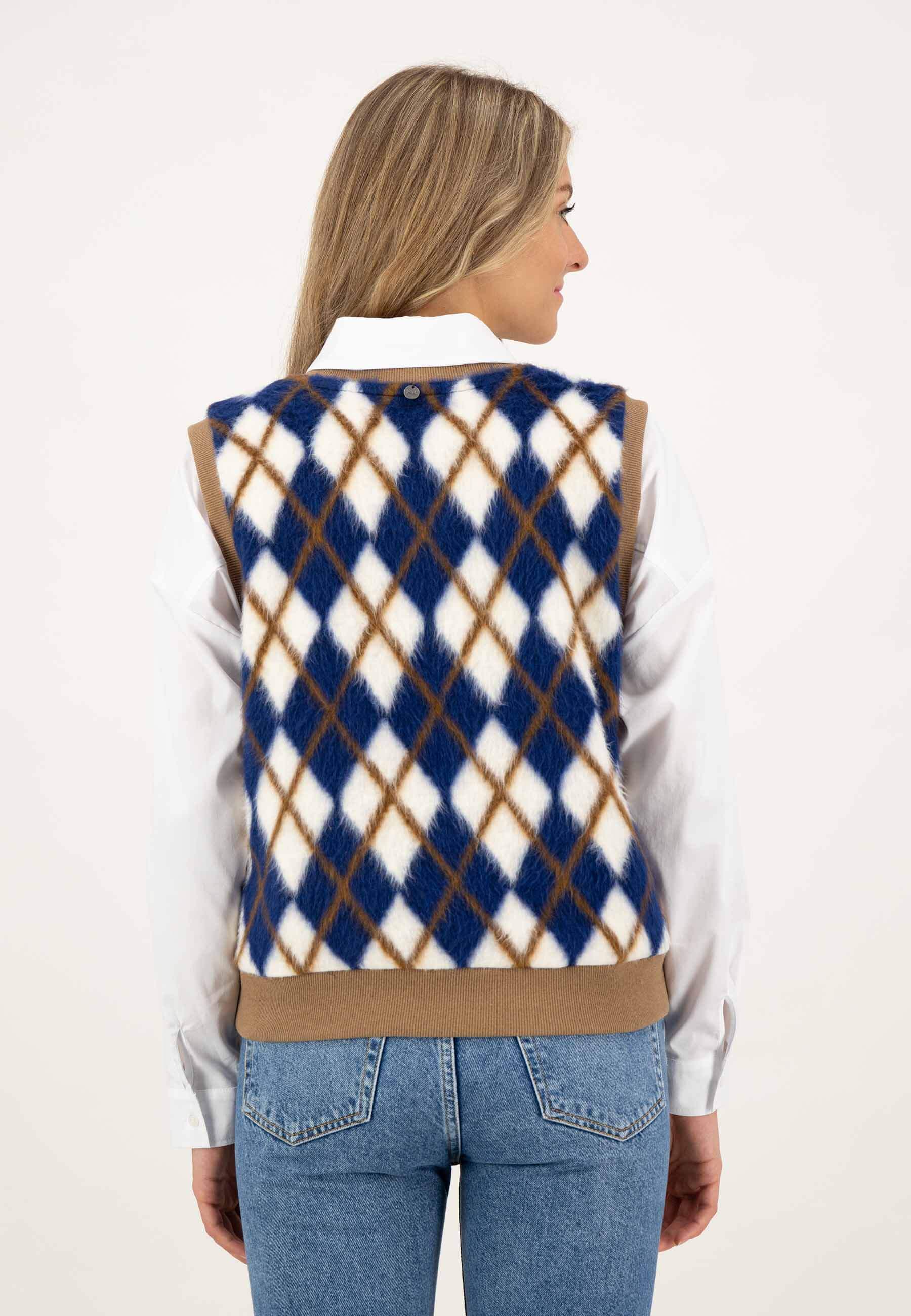 На сайте указаны российские размеры. Свитер-жилет с ромбовидным узором синего цвета. Благодаря своему красивому рисунку, широкому низу и V-образному вырезу этот комбинезон не только визуально привлекает внимание, но и сохраняет тепло и уют. Наша модель ростом 177 см. Измерения для 44 размера: Окружность груди: 99 см Талия: 100 см Бедра: 96 см Длина по спинке: 59 см.