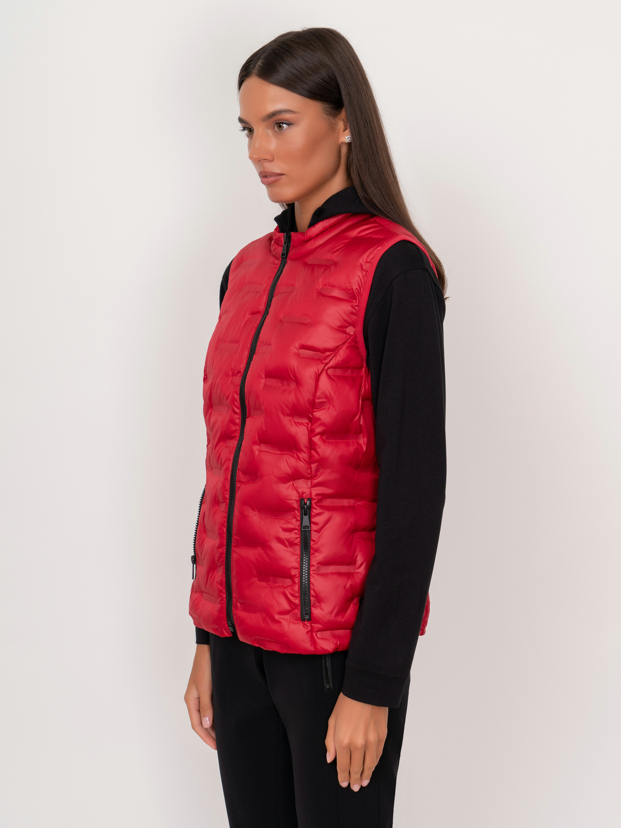 На сайте указаны российские размеры. Утепленный полуприталенный красный жилет на молнии, с воротником-стойка, с прорезными карманами. Рост модели: 175 см. Длина жилета: 62 см.
