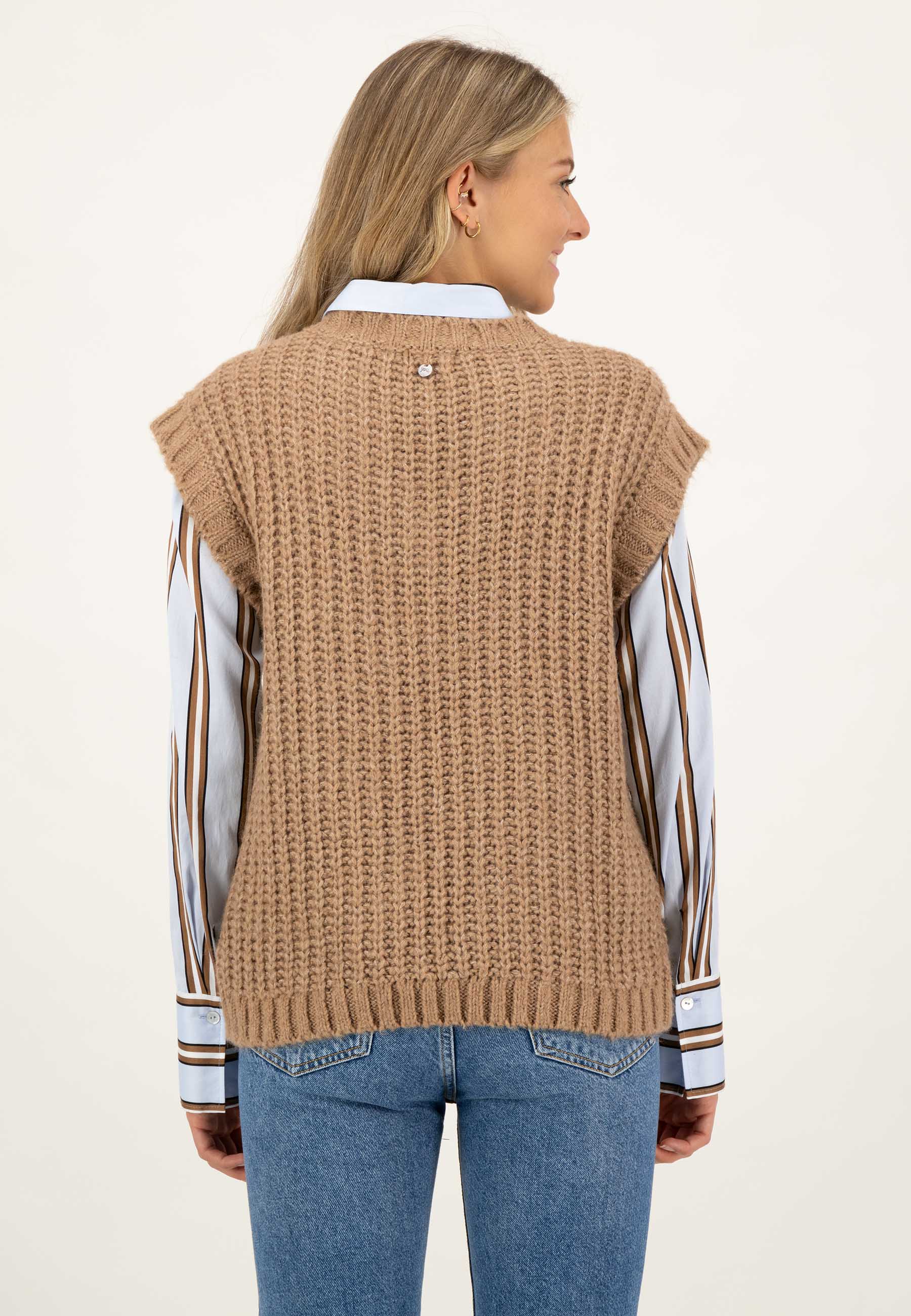 На сайте указаны российские размеры. Приятный мягкий свитер-жилет. С этой моделью из высококачественных материалов вы сможете создавать крутые образы в холодные дни. Благодаря V-образному вырезу слиповер идеально сочетается с блузой с отложным воротником или воротником-стойкой или со свитером с высоким воротником. Свободный крой в сочетании с ребристым вязанием и контрастным вязанием на рукавах, V-образном вырезе и по низу придают комбинезону спортивный и повседневный вид. Рост модели: 177 см. Измерения для 44 размера: Окружность груди: 57 см Бедра: 37 см Длина по спинке: 53 см Пройма: 25см