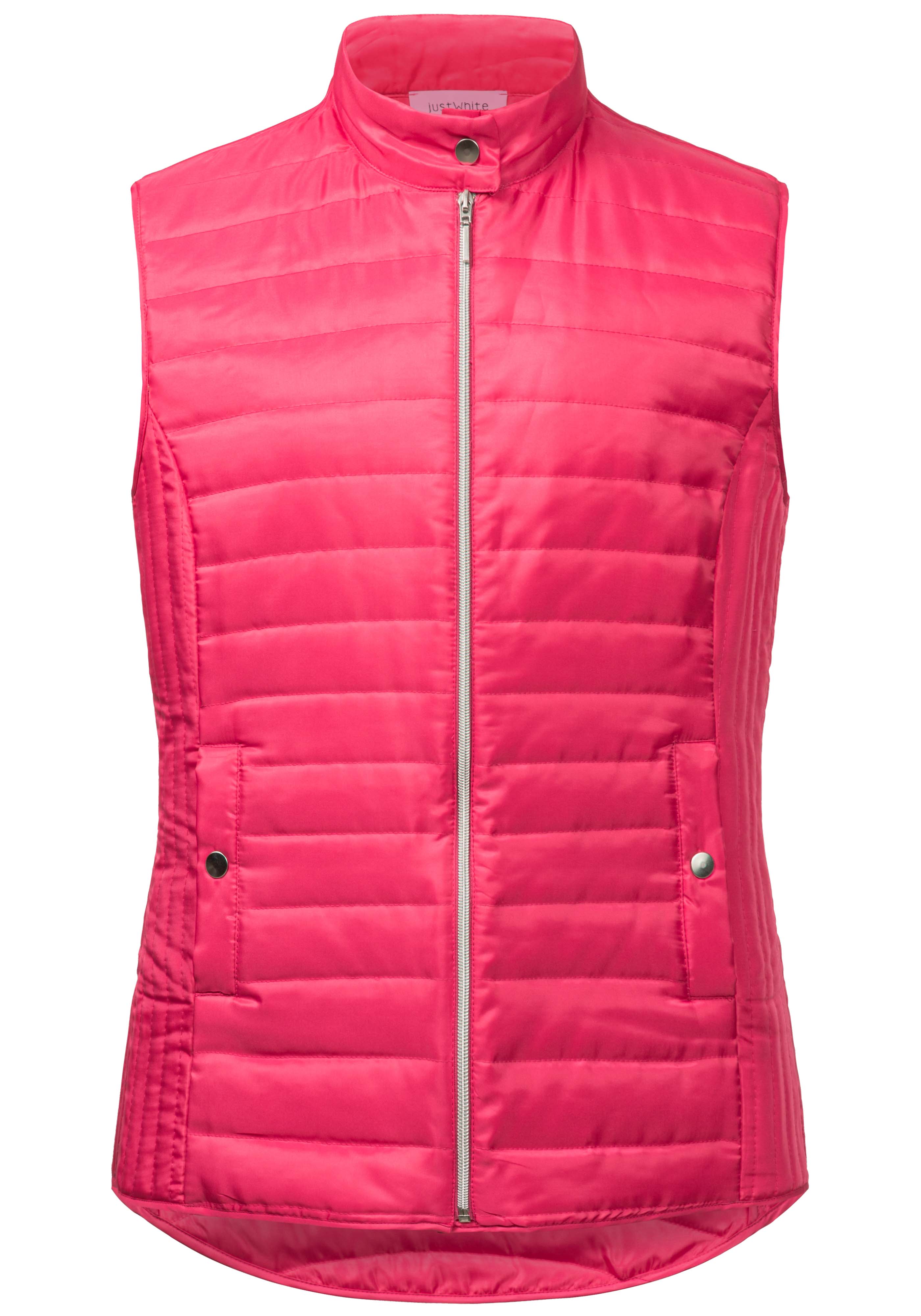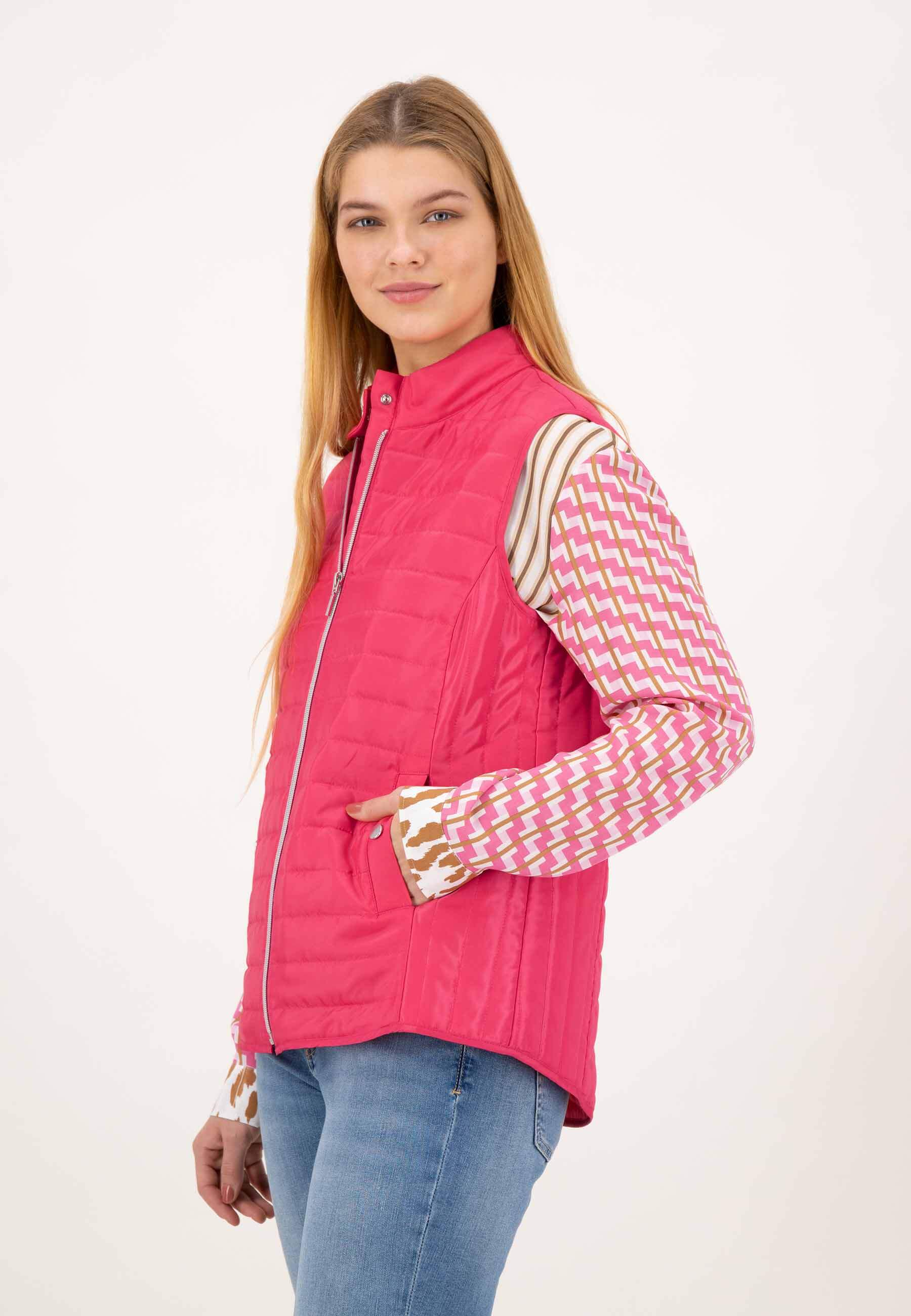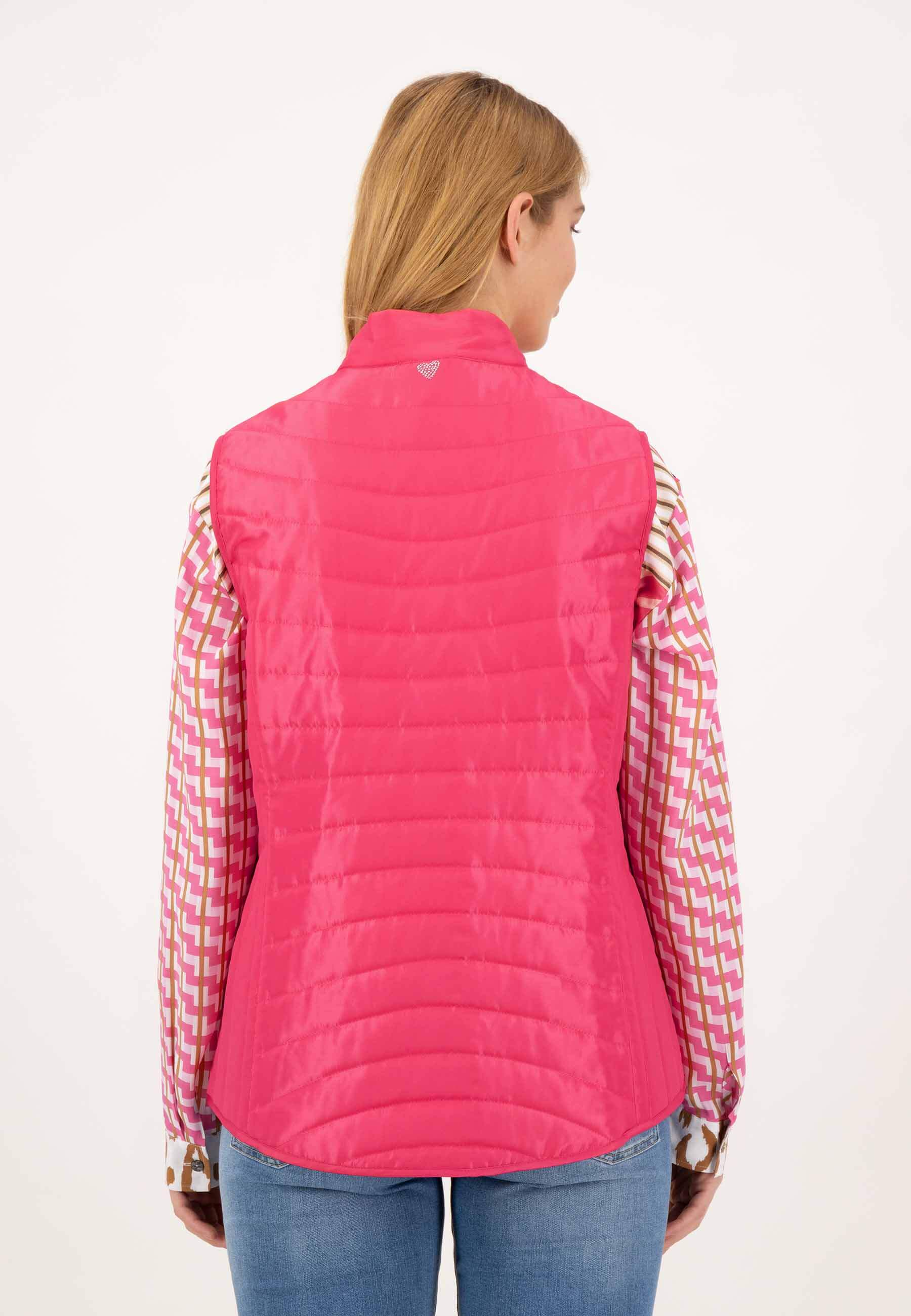 На сайте указаны российские размеры. Женственный спортивный стеганый жилет из легкого высококачественного материала. Жилет впечатляет своим лаконичным видом благодаря горизонтальной стежке, которая сочетается с продольной стежкой по бокам. Эта комбинация также делает их фигуру льстивой. Его можно комбинировать по-разному, и благодаря насыщенному розовому цвету он придает каждому образу что-то свое. Женственный спортивный образ подчеркивают два боковых кармана, которые можно застегнуть на кнопку. Еще одним привлекательным элементом жилета является тонкое блестящее сердце под воротником-стойкой на спине. Модель ростом 177 см Измерения для 44 размера: Окружность груди: 103 см Талия: 96 см Бедра: 115см Длина по спинке: 68 см