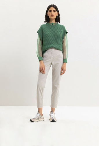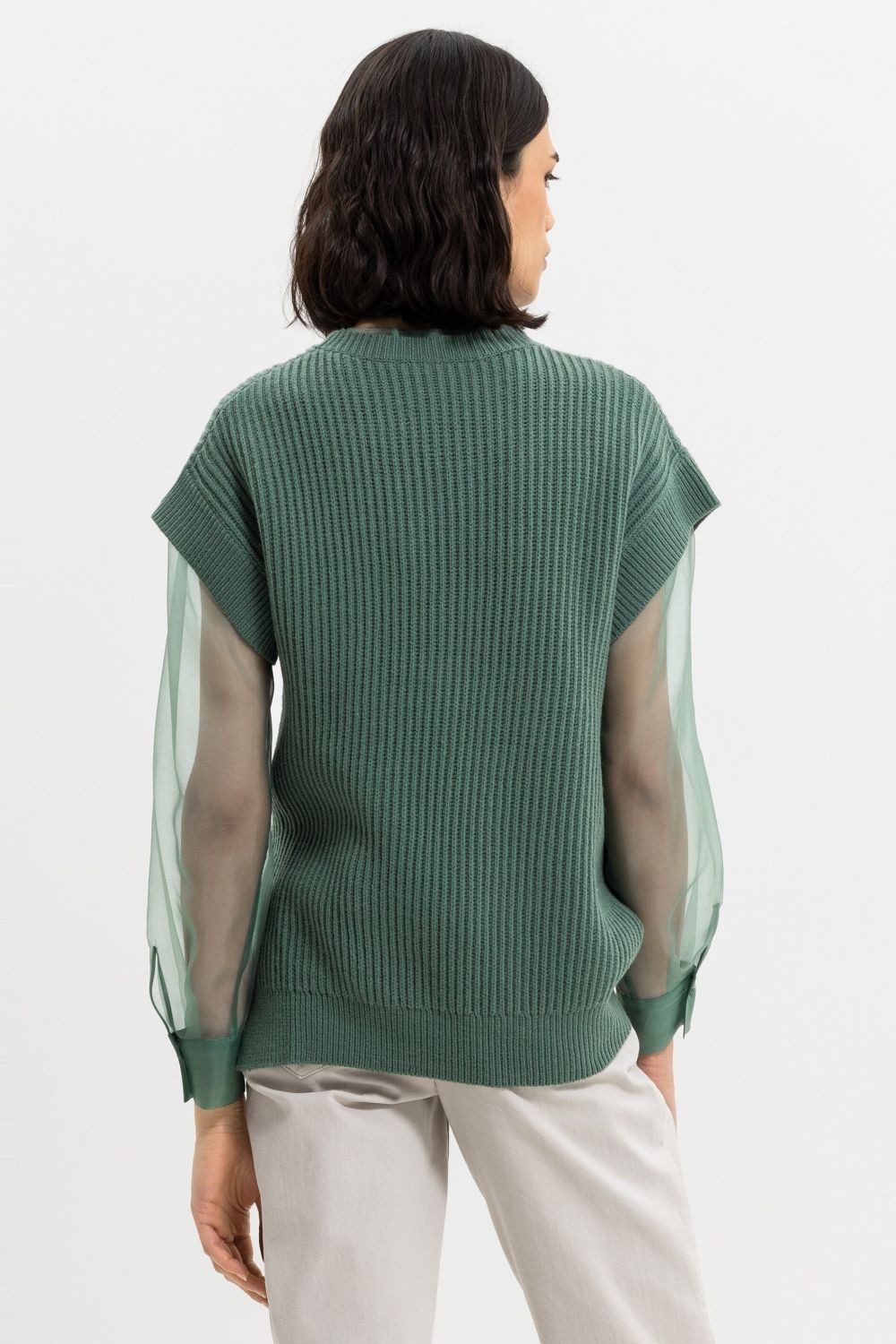 На сайте указаны российские размеры. Трикотажный жилет из легкой смесовой шерстяной резинки с воротником-стойкой, заниженной линией плеча и вязанным резинкой низом. Встроенные уменьшающиеся детали и асимметричные швы подчеркивают повседневный дизайн. Рост модели: 178 см.
