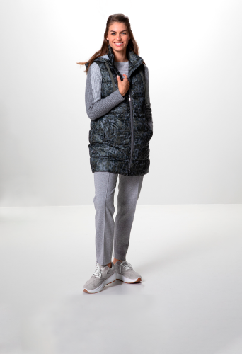 На сайте указаны российские размеры. Стеганый жилет впечатляет модным анималистическим принтом и многими другими деталями. Благодаря высококачественному материалу и прямому крою его очень удобно носить. Воротник-стойка в сочетании с капюшоном и завязками делают жилет идеальным компаньоном в холодные дни. Боковые карманы и боковые разрезы завершают повседневный образ жилета без рукавов. Длина модели в 44 размере около 83 см.