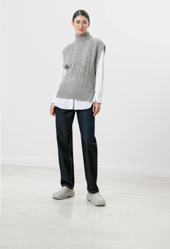 На сайте указаны российские размеры. Уютный жилет из фактурного вязаного трикотажа прямого свободного силуэта с широким воротником-стойка, резинкой и разрезами по низу. Прекрасная вещь для второго слоя при создании утепленных осенних образов. Рост модели на фото - 175 см.