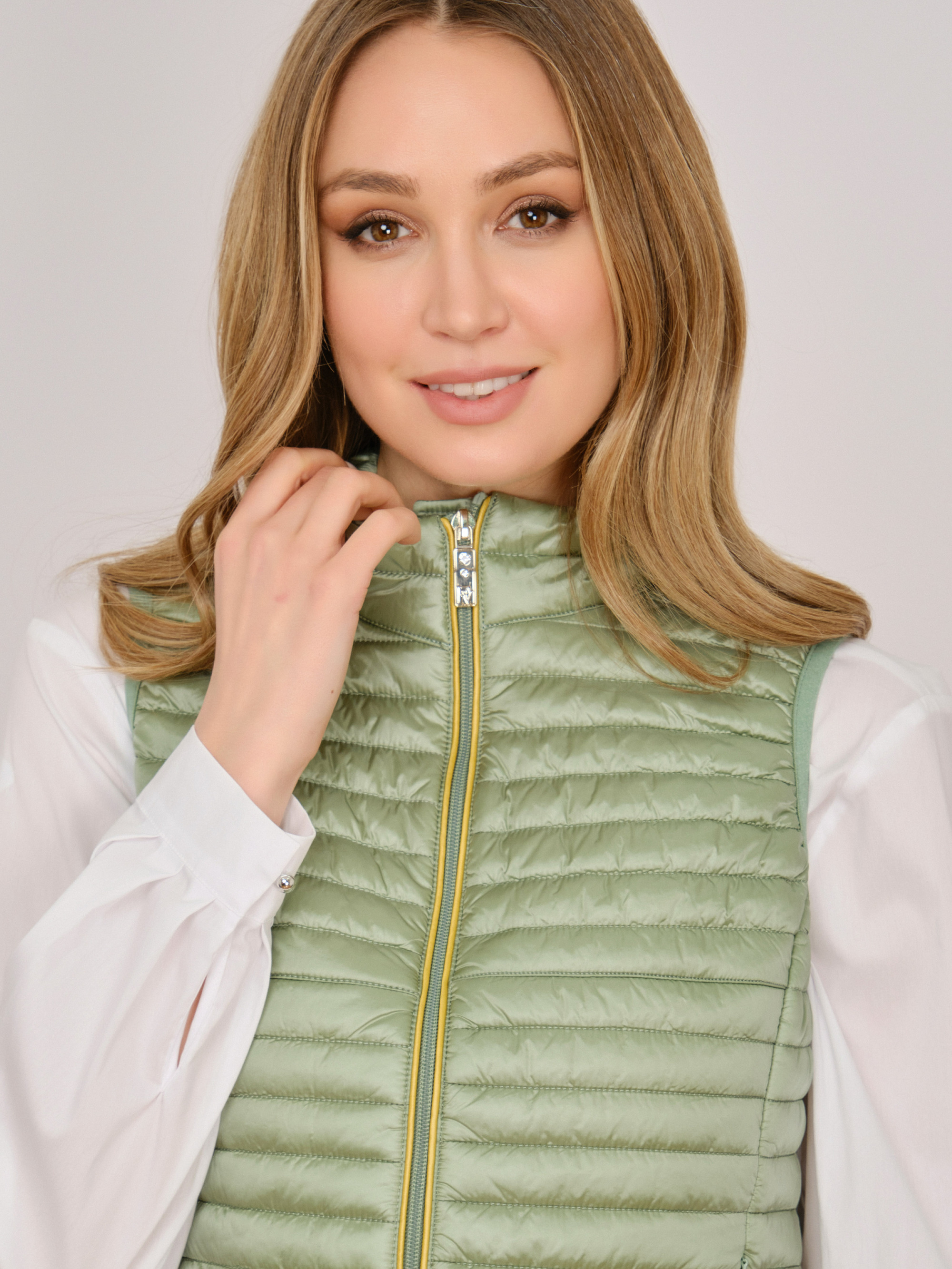 На сайте указаны российские размеры. Полуприталенный стеганный мятный-зеленый жилет на молнии, с карманами в шве на молнии. Длина по спинке: 54 см. Рост модели: 175 см.