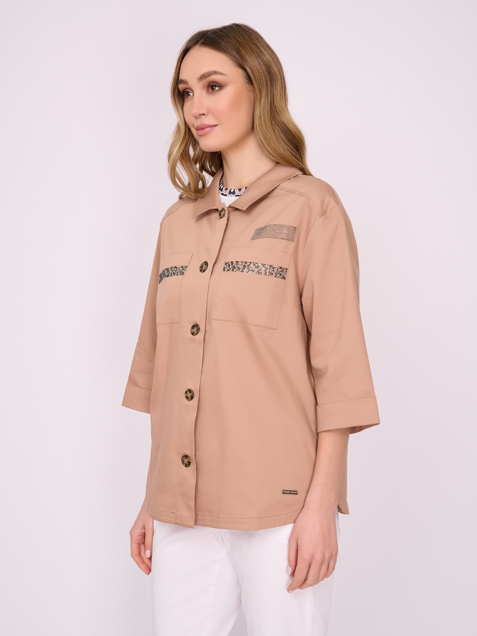 На сайте указаны российские размеры. Бежевый жакет трапеция на пуговицах, с отложным воротником, с накладными карманами, с рукавом 7/8, со стразами, с боковыми разрезами. Длина по спинке: 67 см. Рост модели: 175 см.