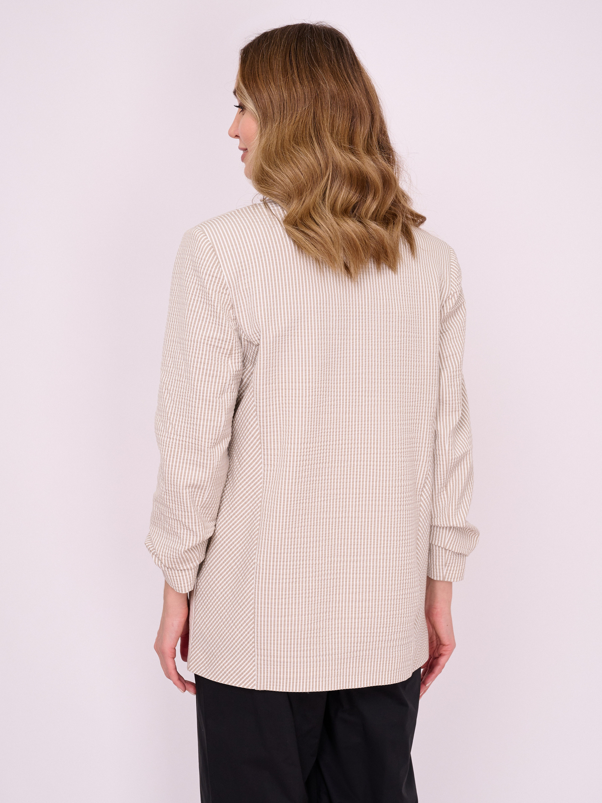 На сайте указаны российские размеры. Жакет прямого покроя с рукавами 7/8, присборенными над запястьем, прорезными карманами с клапанами. Длина по спинке: 70 см. Рост модели 175 см.