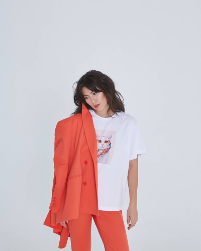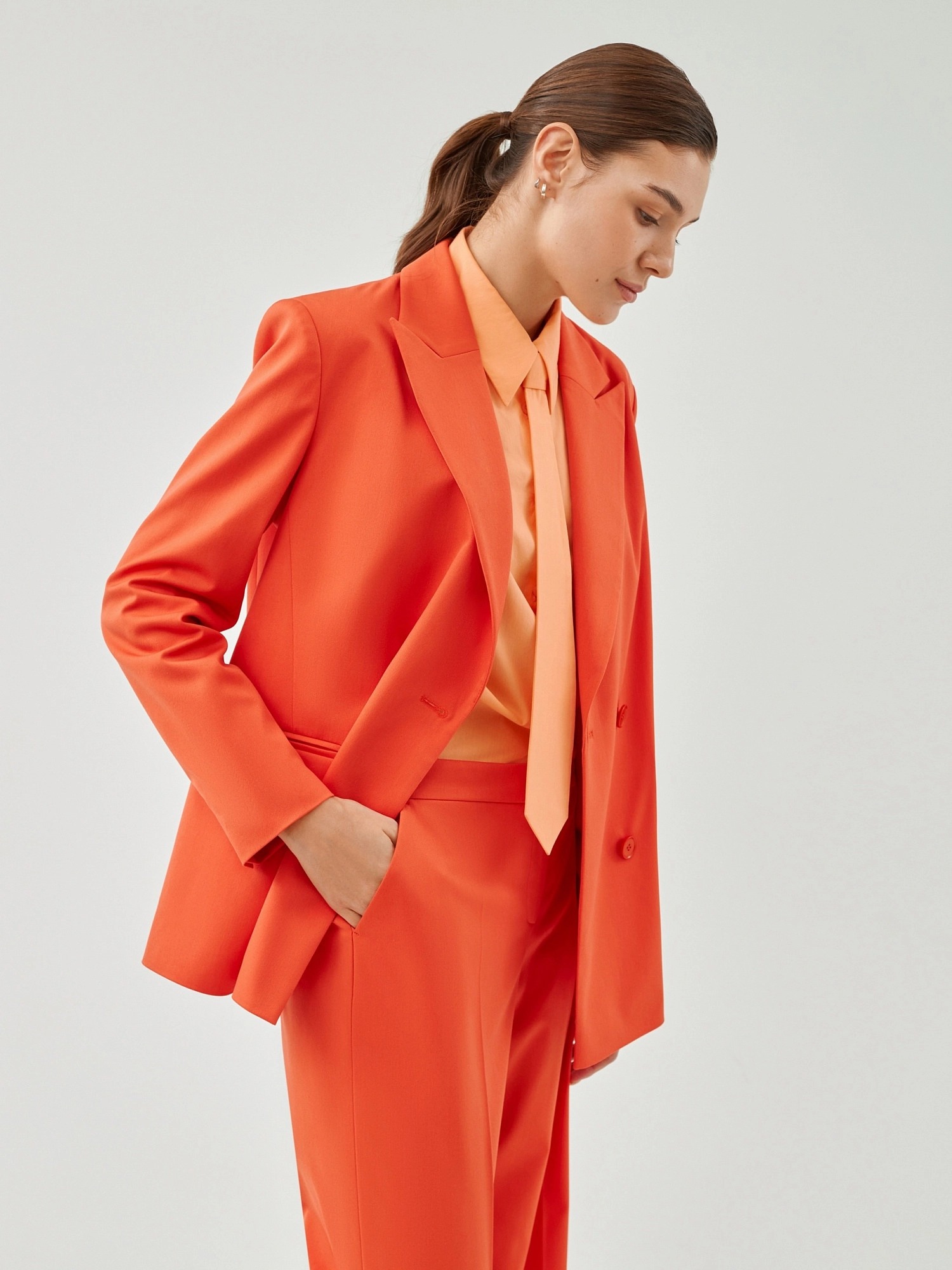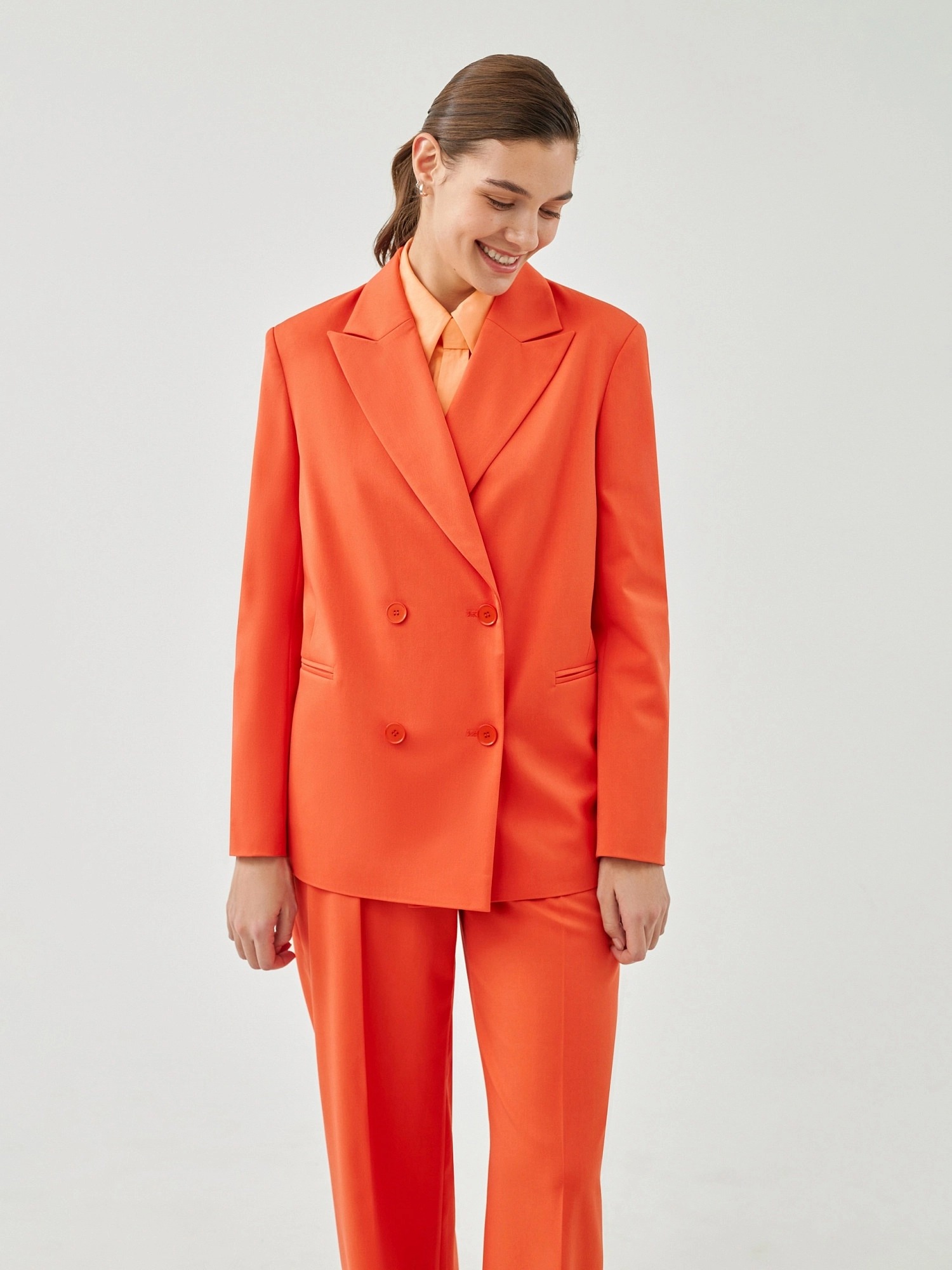На сайте указаны российские размеры. Свободный удлинённый двубортный жакет из костюмной ткани в ярком цвете "грейпфрут". С прорезными карманами листочками и пуговицами в цвет ткани. Жакет полностью на подкладке. Такой жакет составит яркий ансамбль с брюками из одной ткани, а так же будет ярким акцентом в повседневном образе с джинсами. Рост модели 175 см.