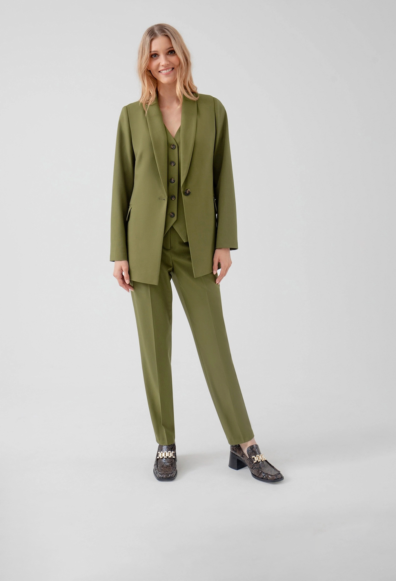 На сайте указаны российские размеры. Прямой удлинённый однобортный жакет с V-образным вырезом, воротником-шаль. С наклонными карманами и клапанами. Жакет полностью на подкладке. Рост модели 175 см.
