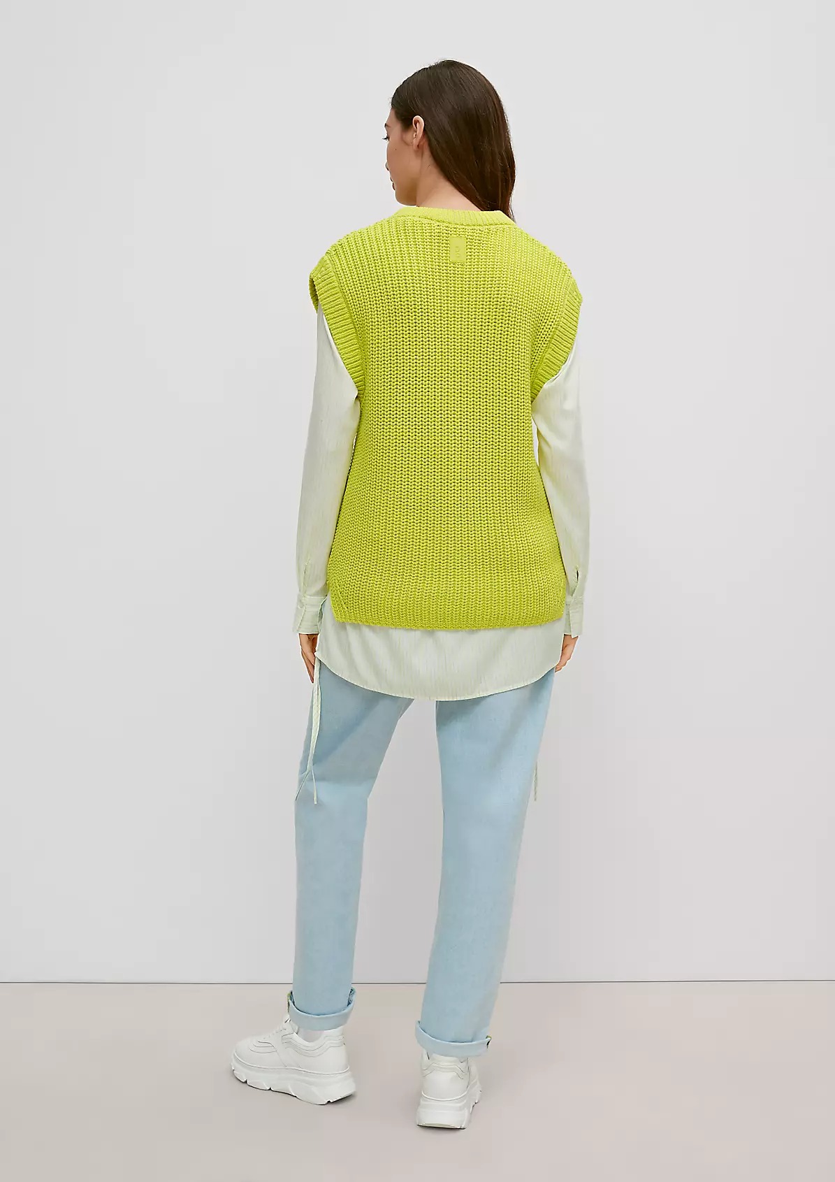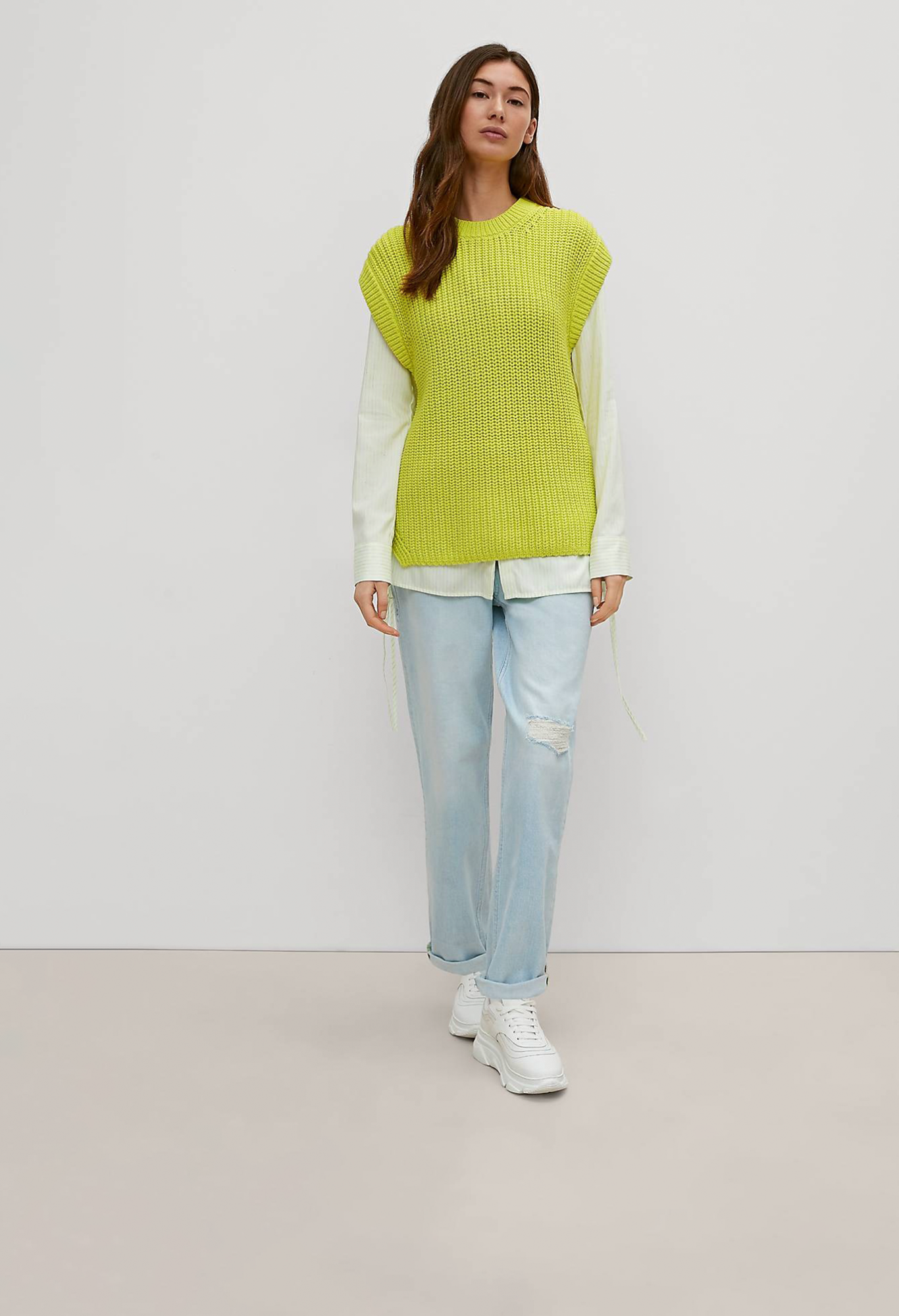 На сайте указаны российские размеры. Вязаный жилет из трикотажа, круглый вырез горловины с окантовкой в рубчик. Подол с разрезом по бокам. Длина спины 65 см в размере 42 Рост модели 178 см.