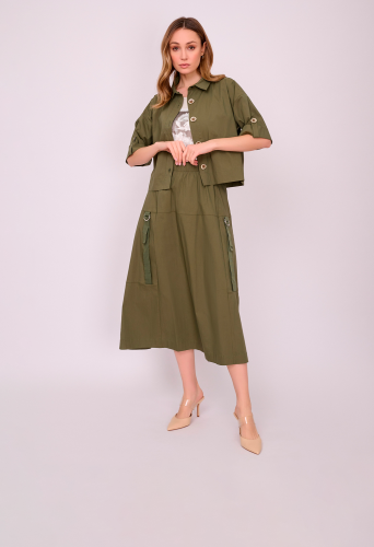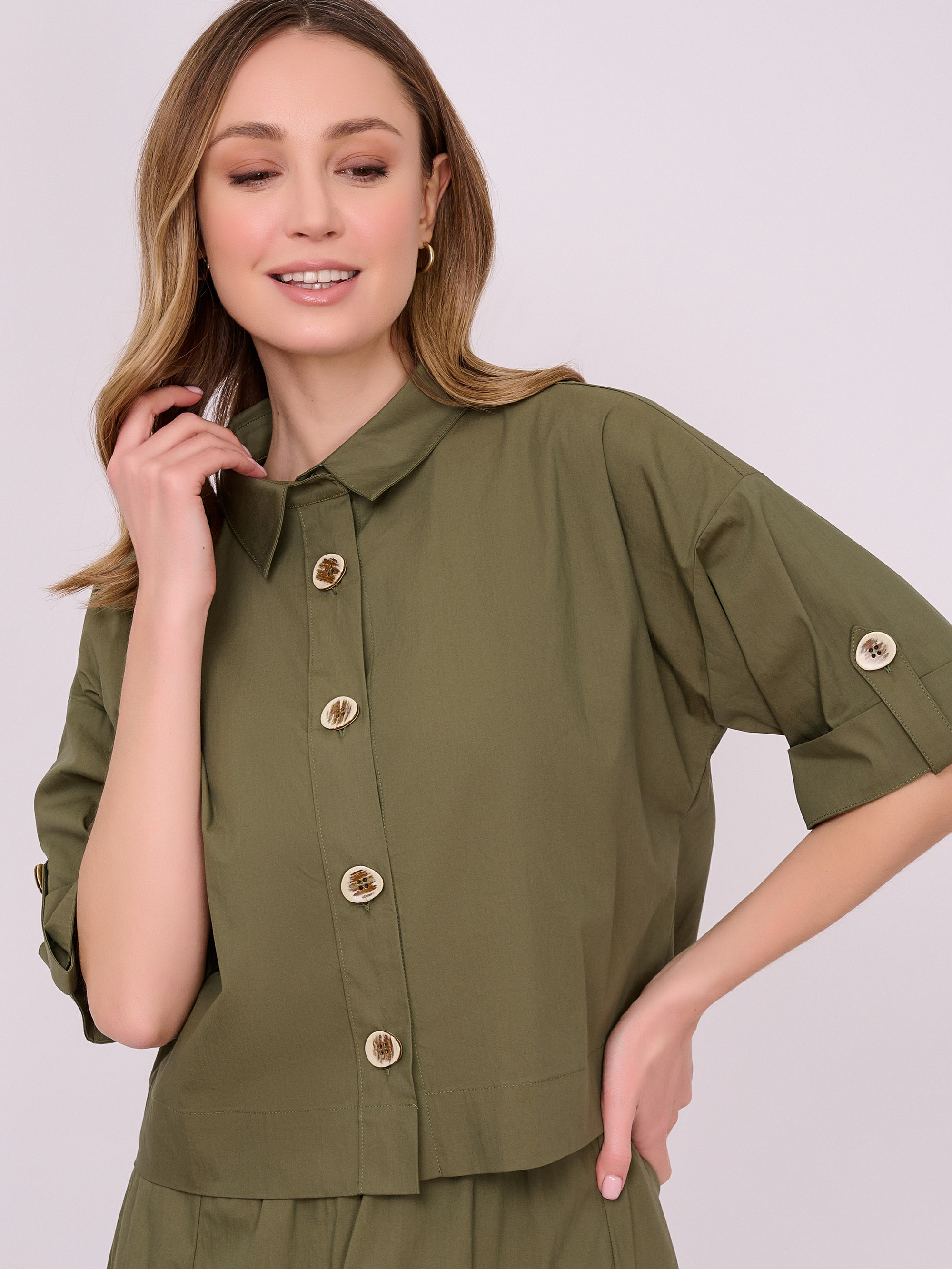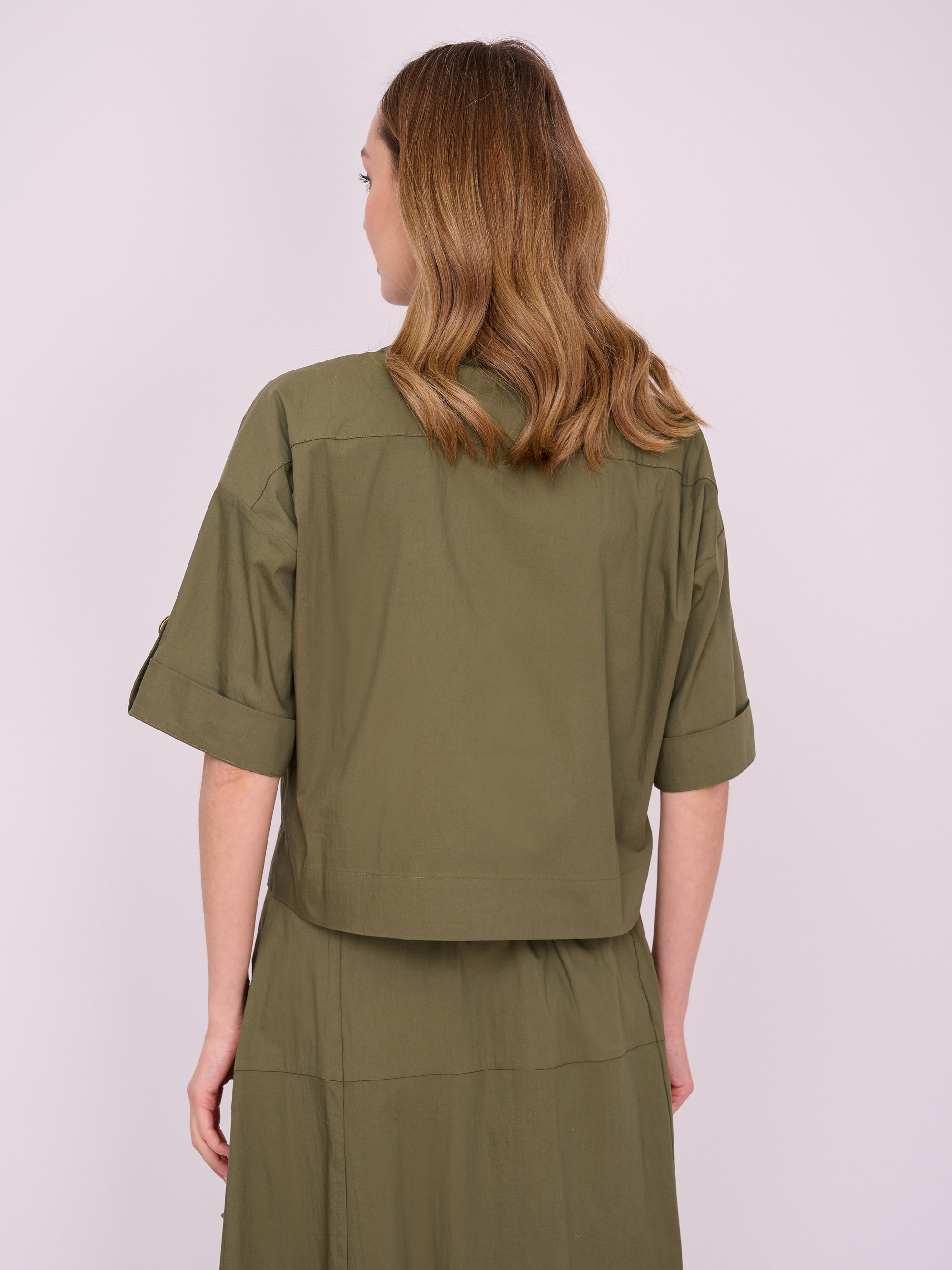 На сайте указаны российские размеры. Укороченный жакет рубашечного покроя на пуговицах с отложным воротником, короткими рукавами с поворотами, накладным карманом на груди. Длина по спинке: 51 см. Рост модели 175 см.