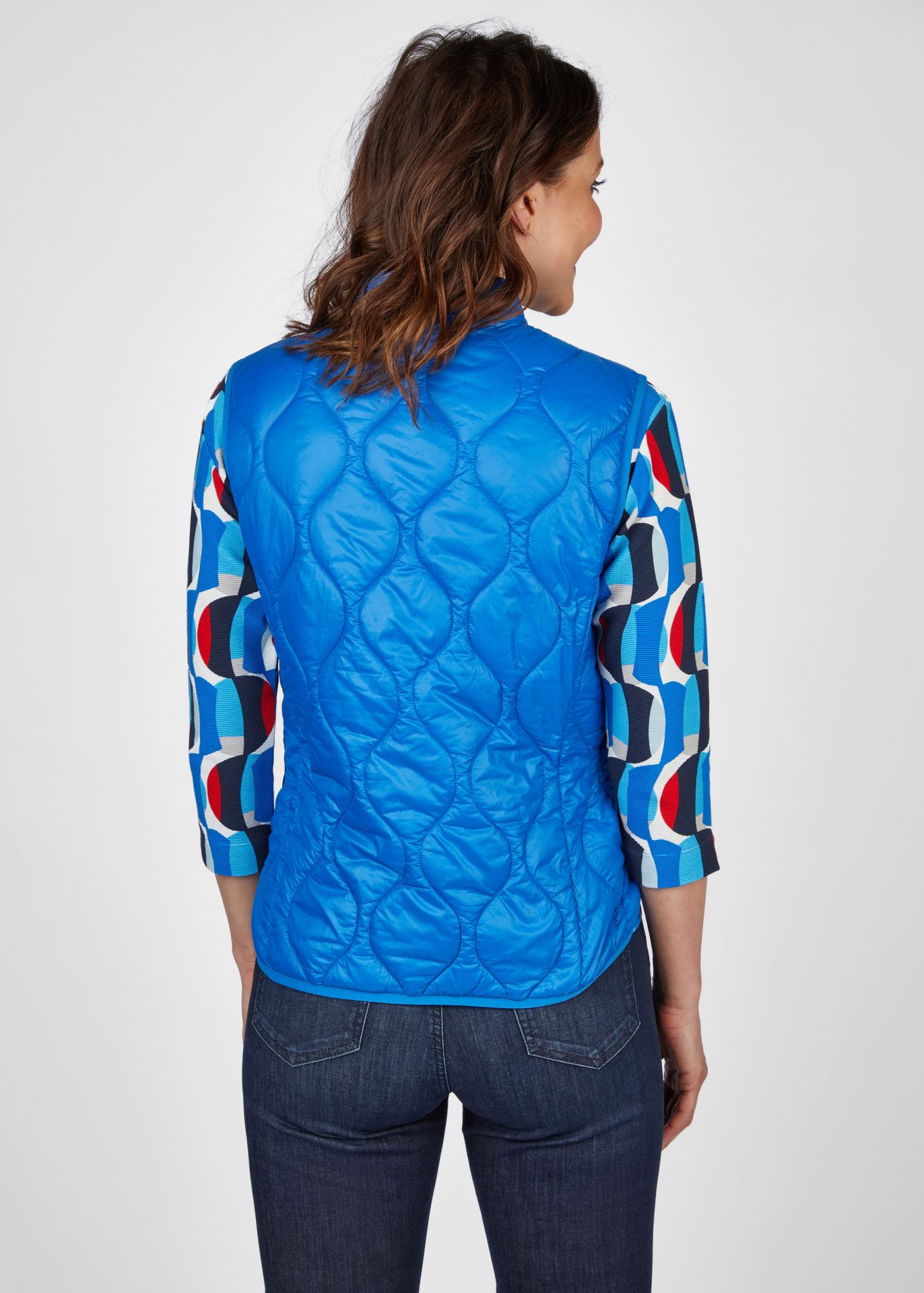 Жилет впечатляет простым однотонным дизайном и современным воротником-стойкой, который защитит от ветра и холода. Практичная молния позволяет легко надевать и снимать сумку, а карманы на молнии сохранят ваши ценные вещи в безопасности. Легкий и дышащий материал обеспечивает оптимальный комфорт в любой ситуации. Этот стеганый жилет можно носить как дополнительный слой под курткой или отдельно поверх блузки. Длина спинки от плеча для 44 размера: 64см.