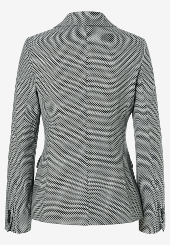 Женственный строгий деловой пиджак с графическим мини-узором черного/бежевого/бежевого цвета. Строгий однобортный костюм. Воротник с лацканами. Карманы с клапанами. Длинный рукав. Длина по размеру 42 - 62 см.