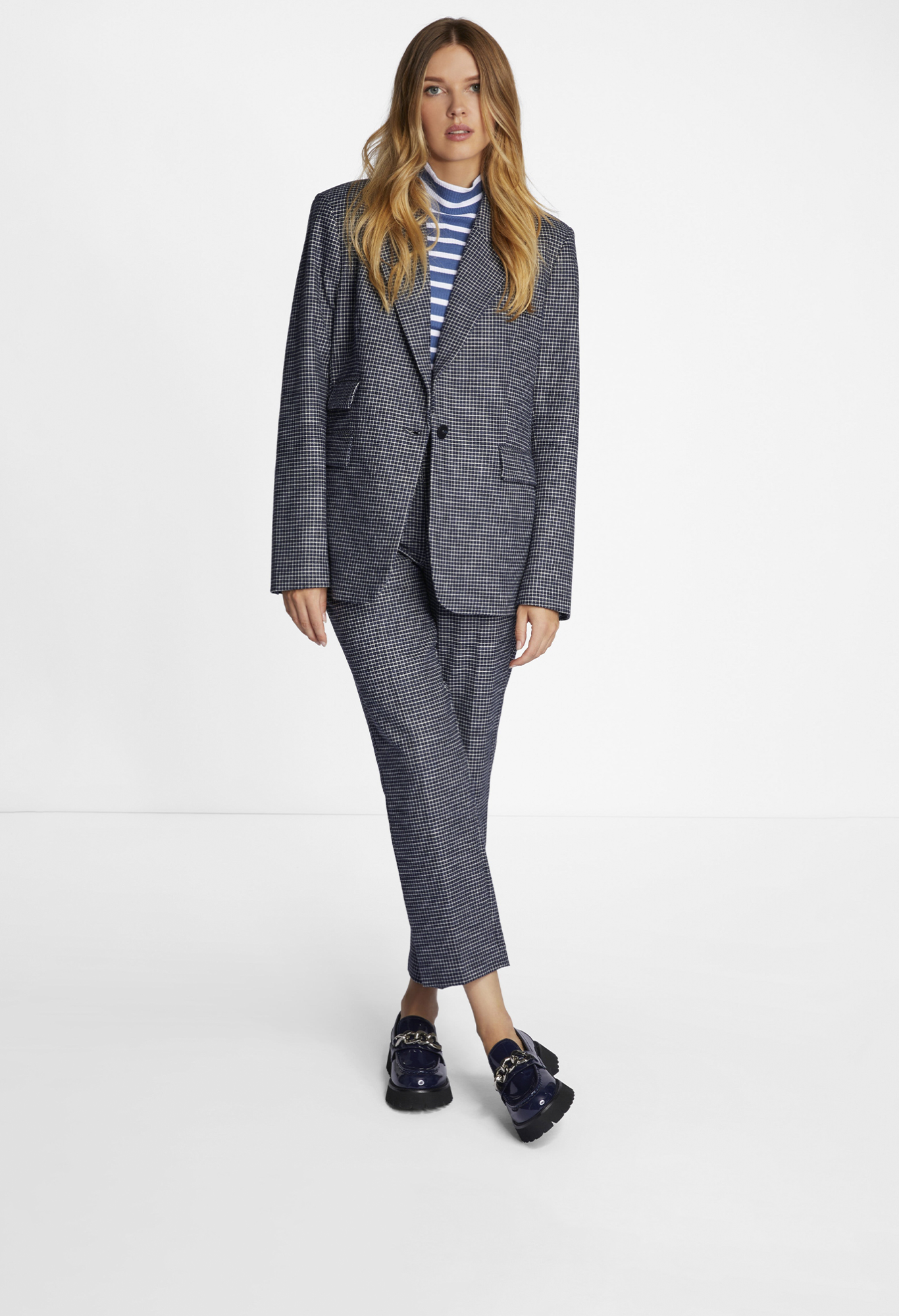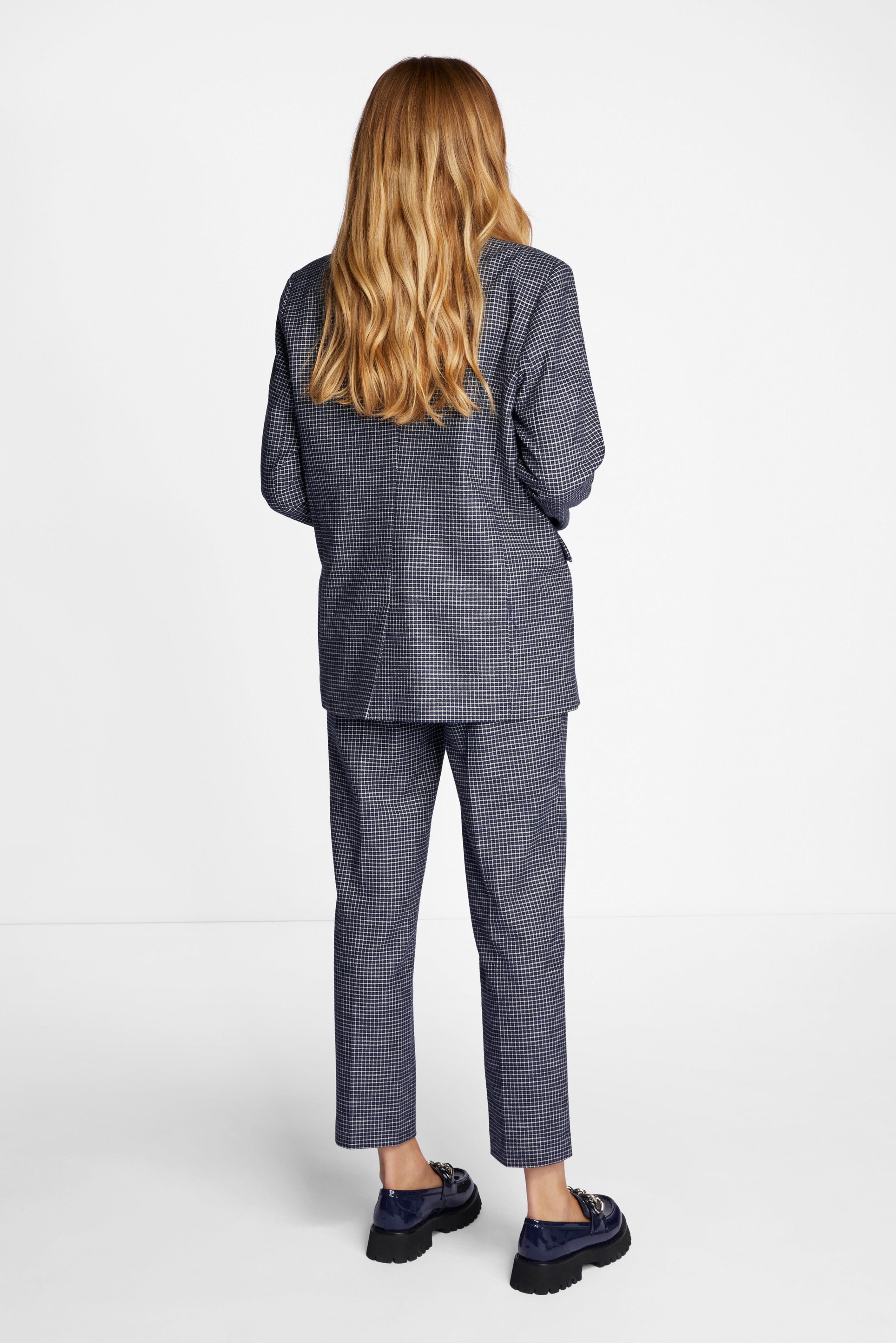 Жакет из мягкой вискозы отличается свободным кроем. Классический узор в клетку и поднимающиеся лацканы привлекают внимание. Накладной карман, карманы с клапанами и разрез сзади дополняют однобортный костюм.
