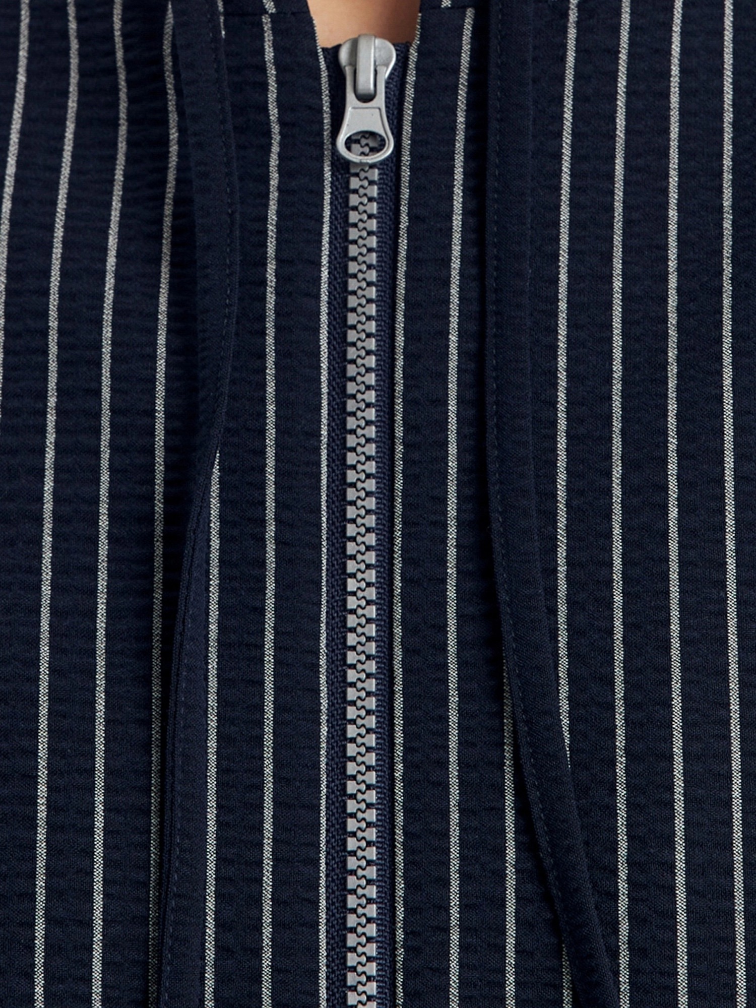 Жакет из фактурной вискозной ткани в тонкую молочную полоску с капюшоном на тракторной молнии. Рубашечный рукав на широкой манжете. Прорезные карманы листочки. Низ бомбера на кулиске.