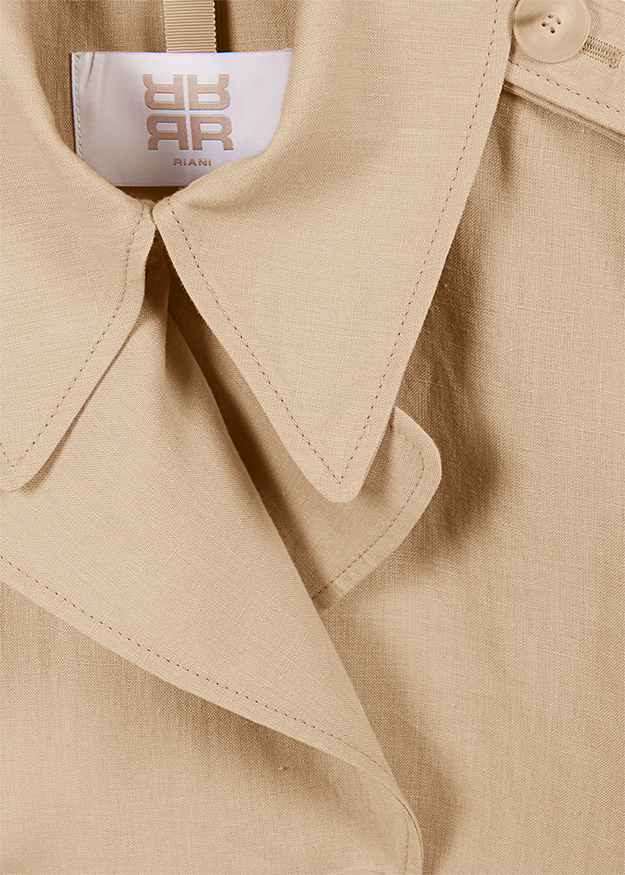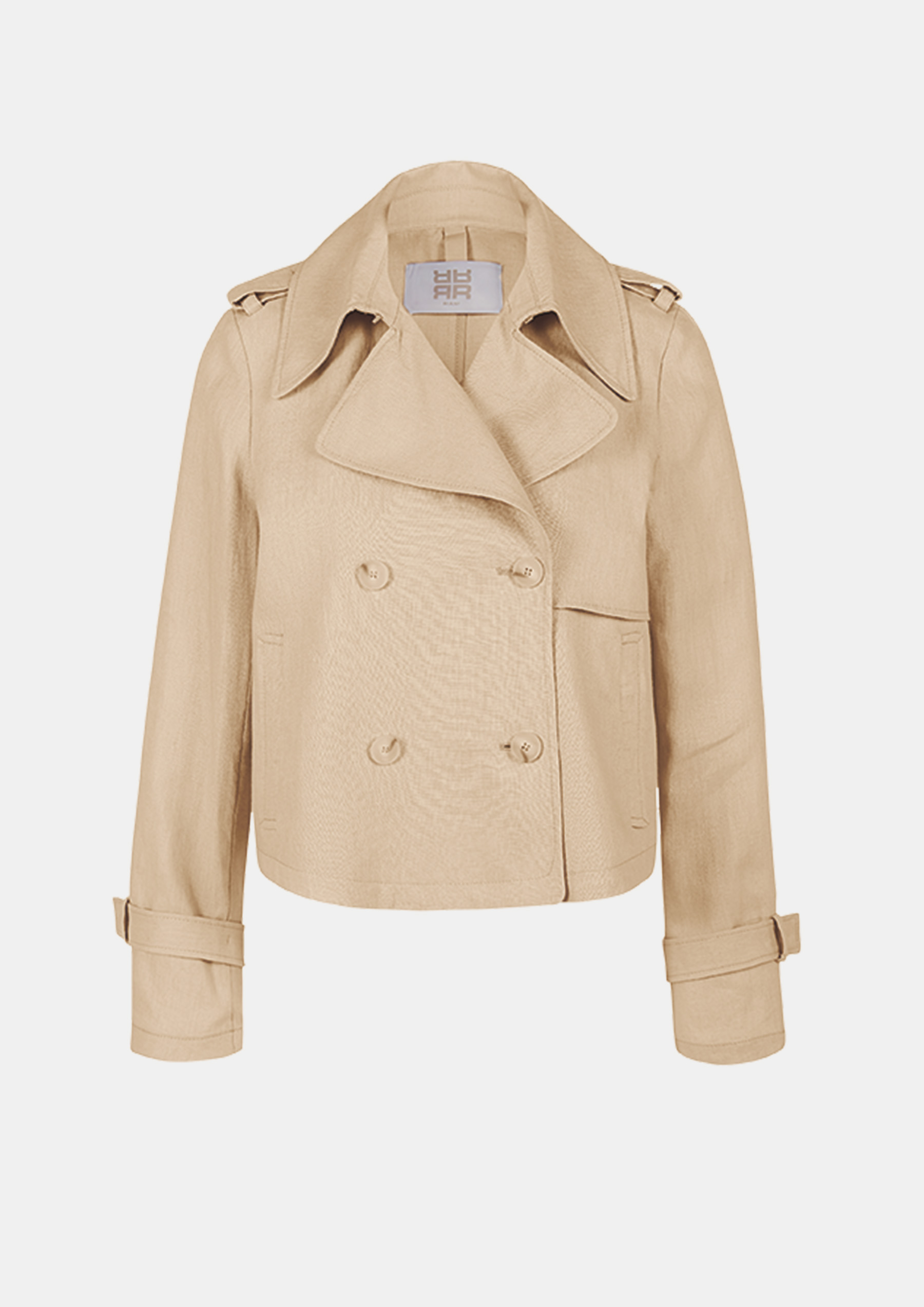 Современный льняной жакет в модном стиле тренча. Этот двубортный пиджак повседневного кроя с типичными элементами тренча станет идеальным спутником на свежем воздухе.