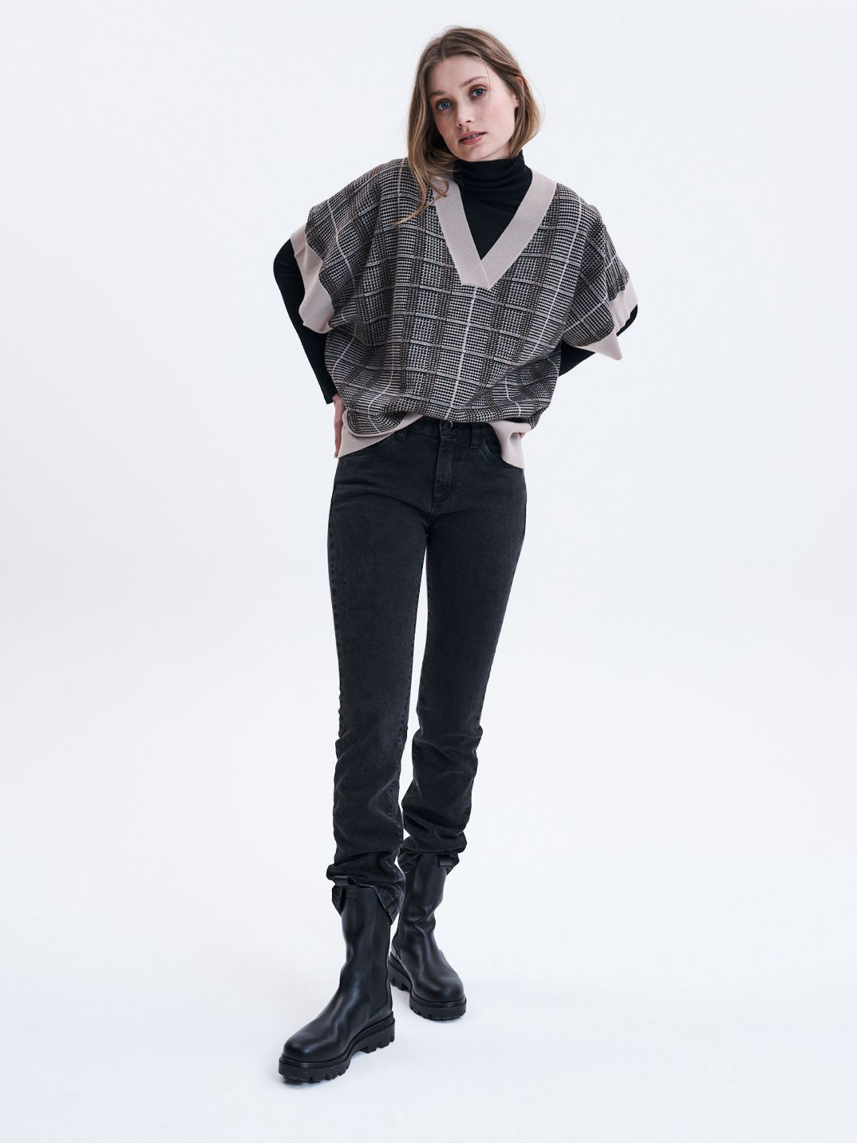 Оверсайз жилет в клетку с V- образным вырезом. Широкие контрастные манжеты в рубчик, спущенная линия плеч. Разрезы в боковых швах. Материал из смесовой шерсти приятен на ошупь и хорошо сохраняет тепло.