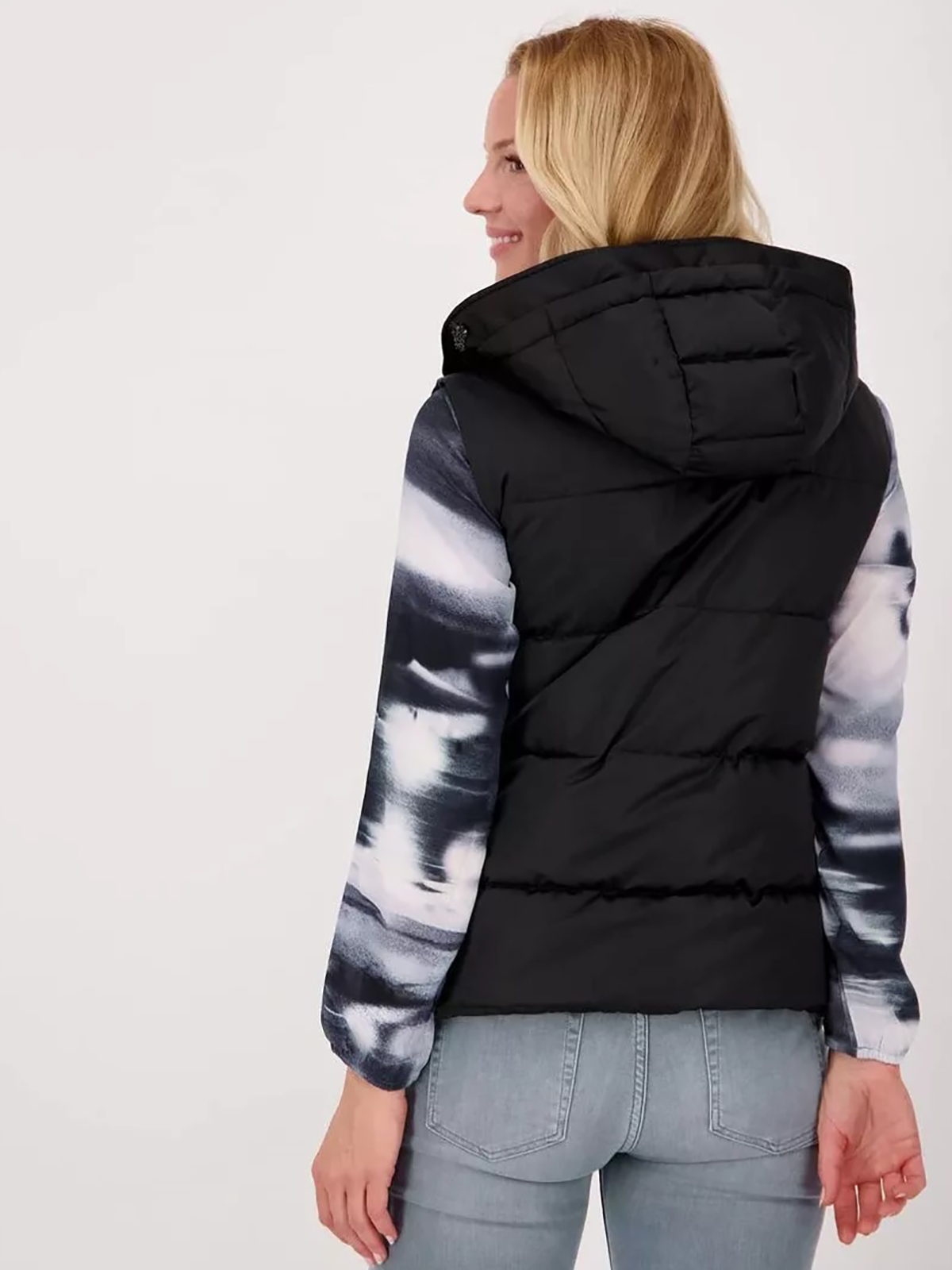 Cтеганый жилет черного цвета – теплый и стильный элемент аутфита. Подойдет для образов в спортивном или повседневном стиле, а также для образов спорт-шик. Застежка на молнию и клепки. Объемный капюшон защищает от ветра.