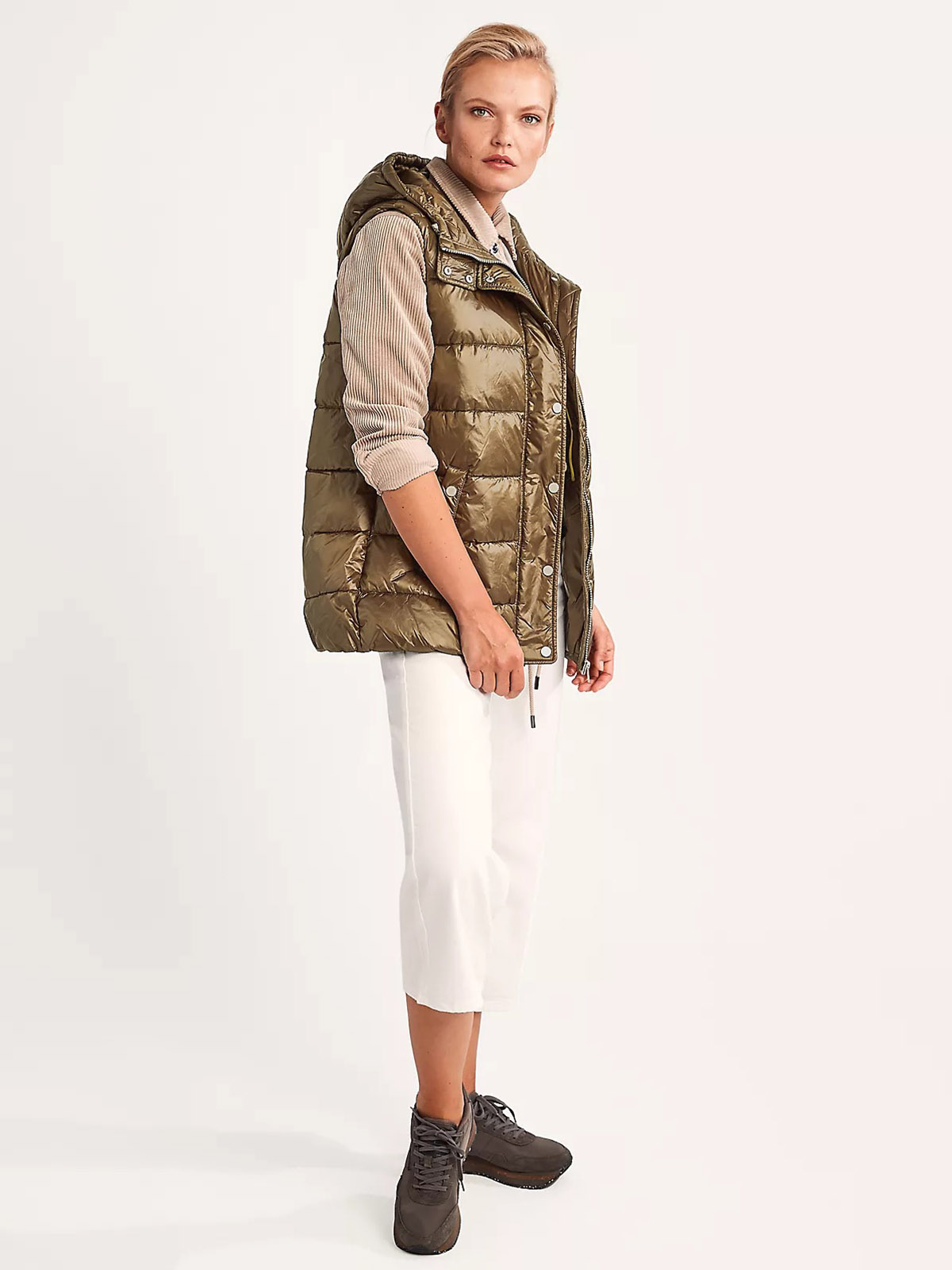 Стеганый жилет с синтепоном наполнителем. Объемный капюшон, застежка на молнию и планка с клепками, прорезные карманы с листочкой. Жилет прекрасно сохраняет тепло и дополняет образ в повседневном городском стиле.
