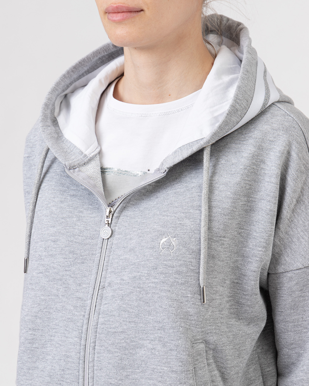 Блейзер прямого кроя с капюшоном в спортивном стиле. Застежка на молнию, втачные рукава ¾ со спущенной линией плеч. Блейзер удачно сочетать с брюками в тон из той же коллекции бренда.