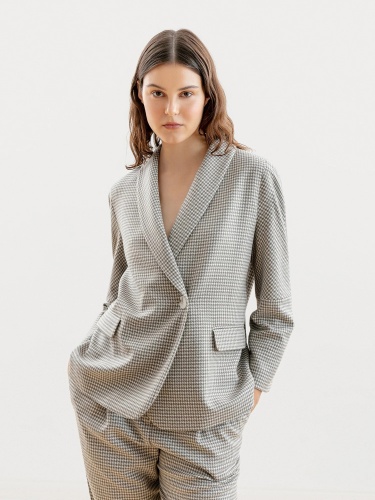 На сайте указаны Российские размеры Прямой удлиненный жакет на подкладке изготовлен из костюмной ткани с принтом пье-де-пуль ("гусиная лапка"). Рукав кимоно и воротник шалька добавят расслабленности вашему офисному дресс-коду. В комплект входит пояс из основной ткани для создания более приталенного силуэта. Рост модели на фото - 175 см.