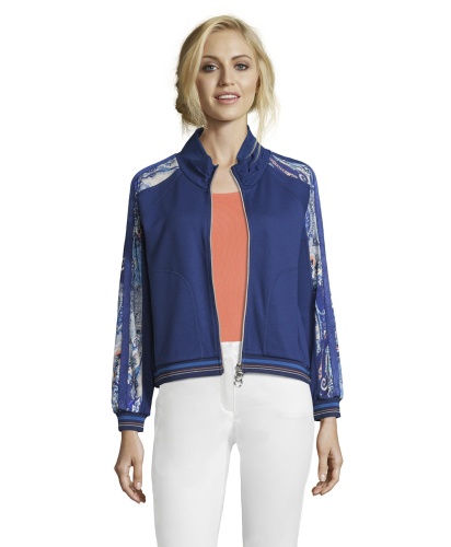 Блейзер в спортивном стиле выглядит очень модно и современно! Прямой покрой, воротник-стойка, застежка-молния, длинные рукава реглан. Трикотажная отделка манжет и низа изделия. Завершающая деталь дизайна - контрастные вставки вдоль рукавов. Материал из вискозной смеси приятен к телу и обеспечивает комфорт. Этот блейзер - прекрасный выбор для прогулки прохладным летним вечером.