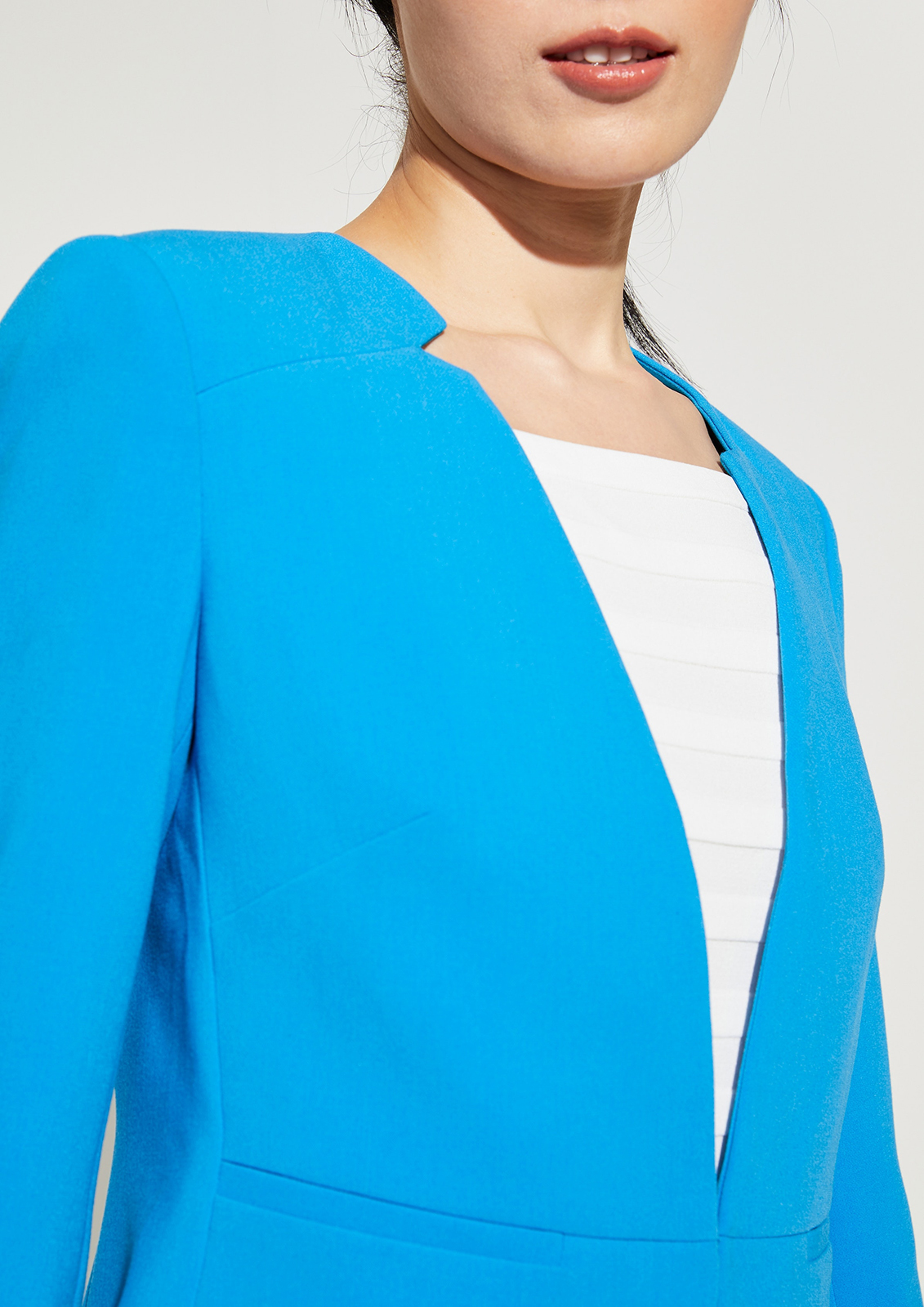 Однотонный яркий жакет с фигурным вырезом. Втачной рукав длины 3/4 с разрезами. Материал из смесовой вискозы приятен к телу и обеспечивает комфорт ношения.