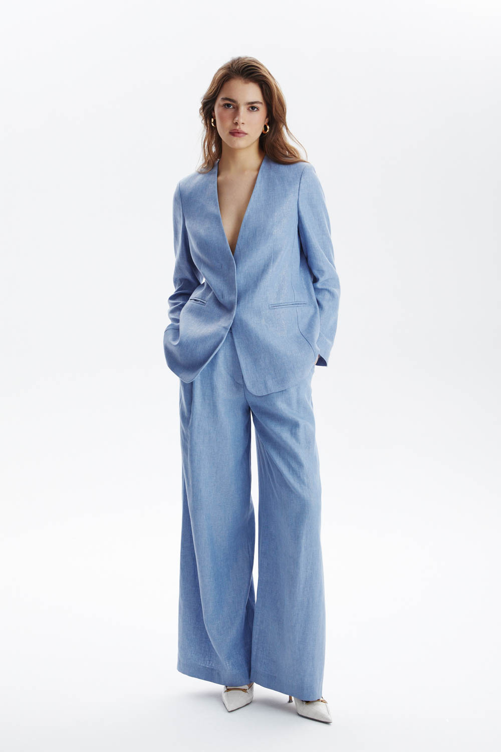 Жакет выполнен в изящном светло-голубом оттенке, который придает образу свежесть и лёгкость. Модель отличается лаконичным и современным кроем с глубоким V-образным вырезом, создающим элегантный и утончённый силуэт. Этот жакет станет прекрасным дополнением как к деловому, так и к повседневному стилю, подчеркивая индивидуальность и хороший вкус.