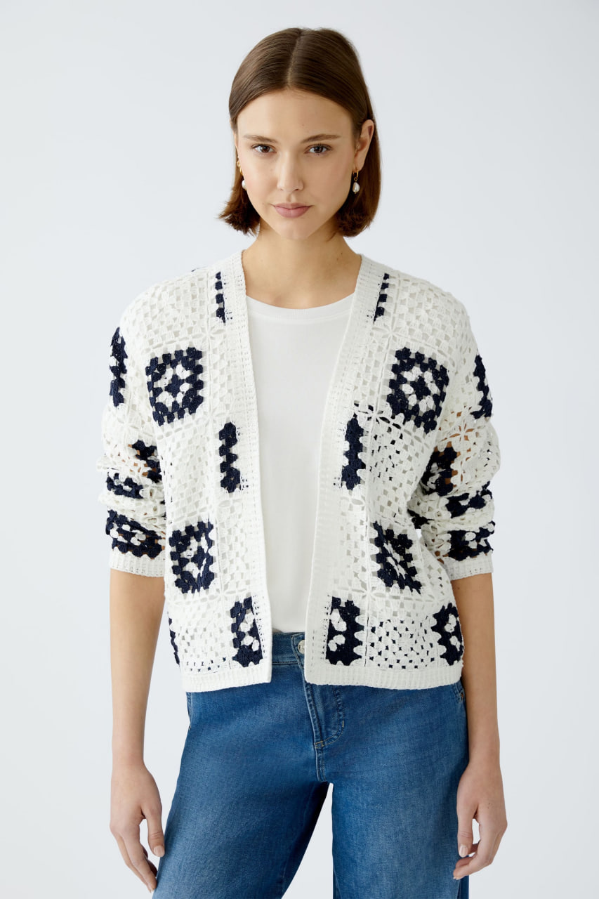 Кардиган отлично подойдет для создания уютных повседневных образов. Благодаря свободному крою и длинным рукавам с манжетами он обеспечивает комфорт в течение всего дня. Геометрический узор добавляет изделию стильный акцент и делает его универсальным элементом гардероба.