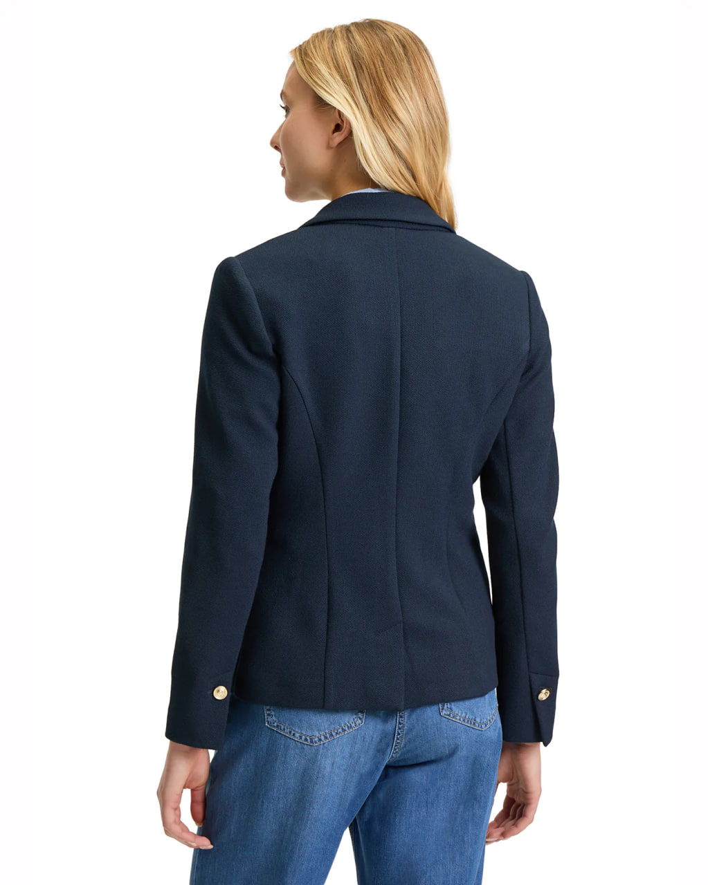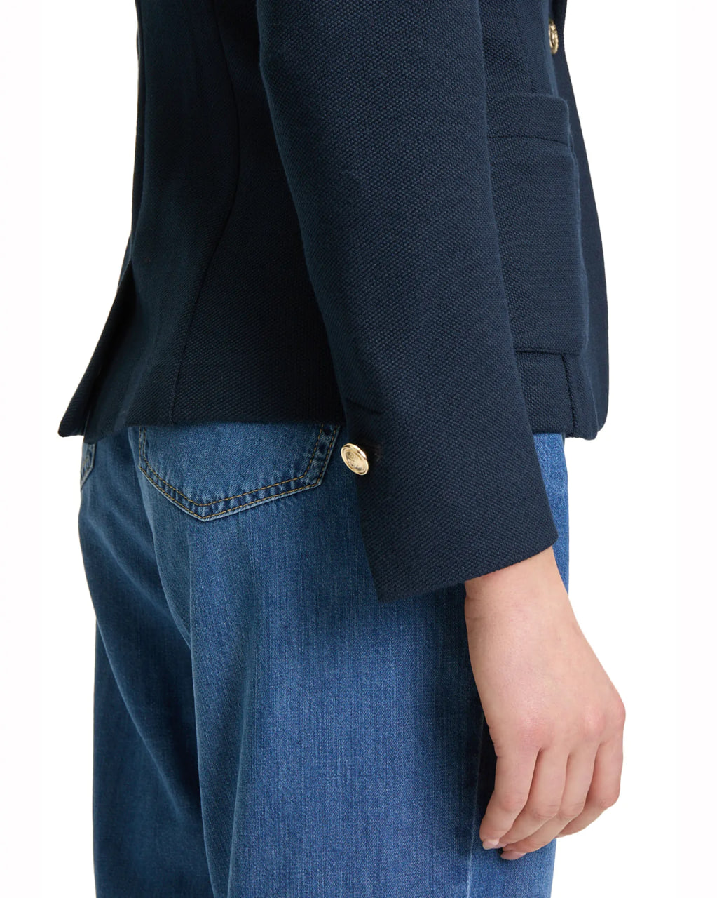 Приталенный блейзер Betty Barclay темно-синего цвета в строчный рисунок. Модель с лацканами, застежка на одну пуговицу, накладные карманы по бокам. Блейзер - универсальная вещь вашего гардероба.