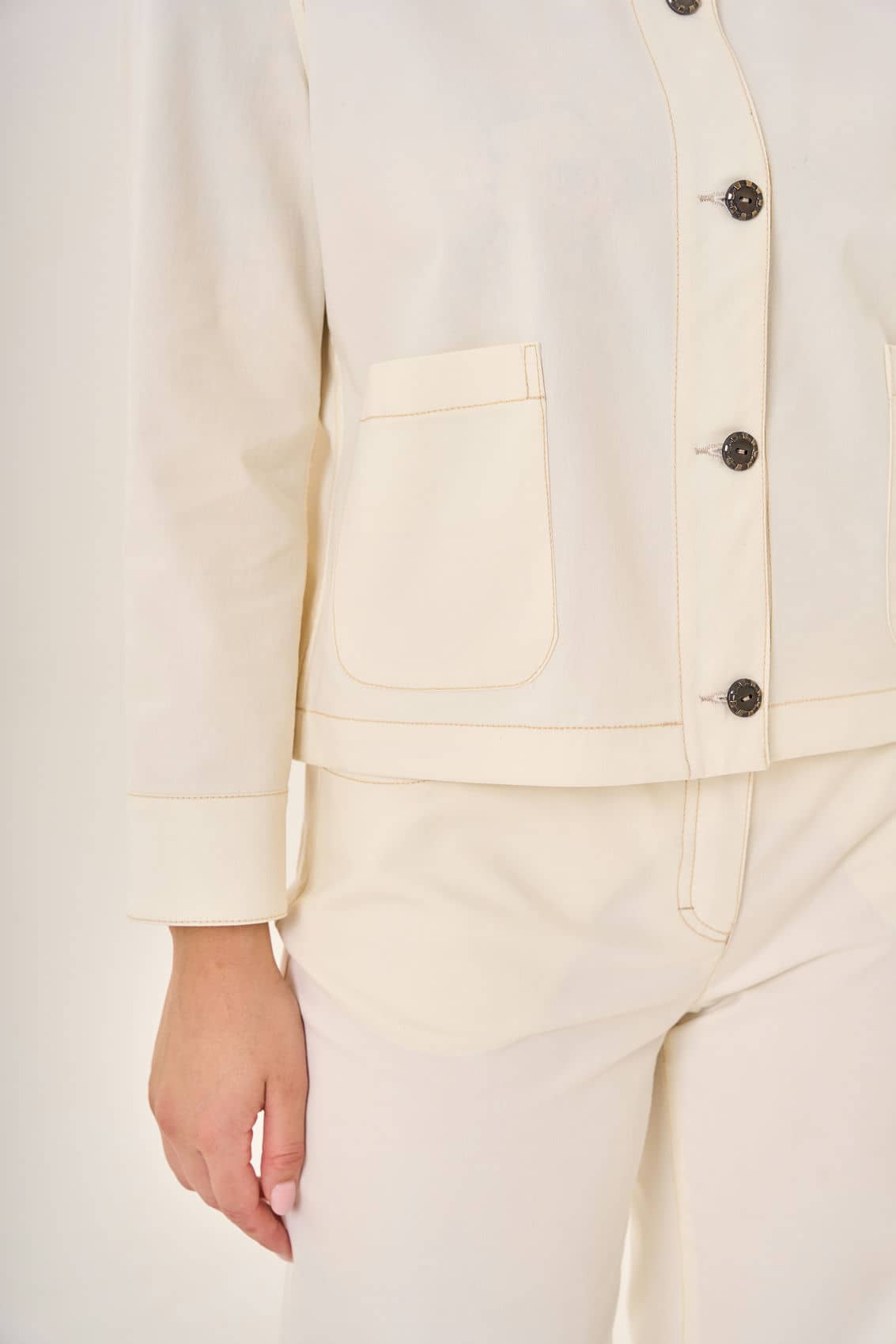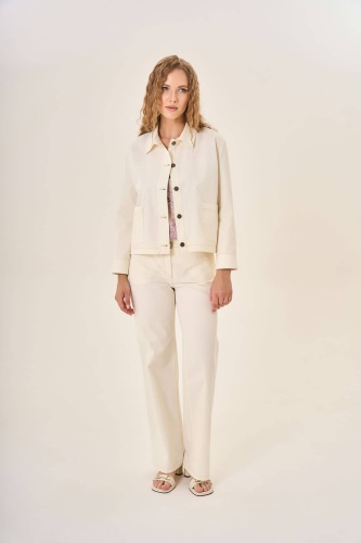 Жакет с классическим отложным воротником и длинными рукавами демонстрирует сдержанный шик. Пяти тёмных пуговиц достаточно, чтобы подчеркнуть строгий силуэт и добавить аккуратности общему виду. Пару накладных карманов впереди удачно завершают композицию, обеспечивая функциональность и дополняя образ лаконичностью деталей. Прочный и качественный материал жакета гарантирует комфорт даже в самую переменчивую погоду.